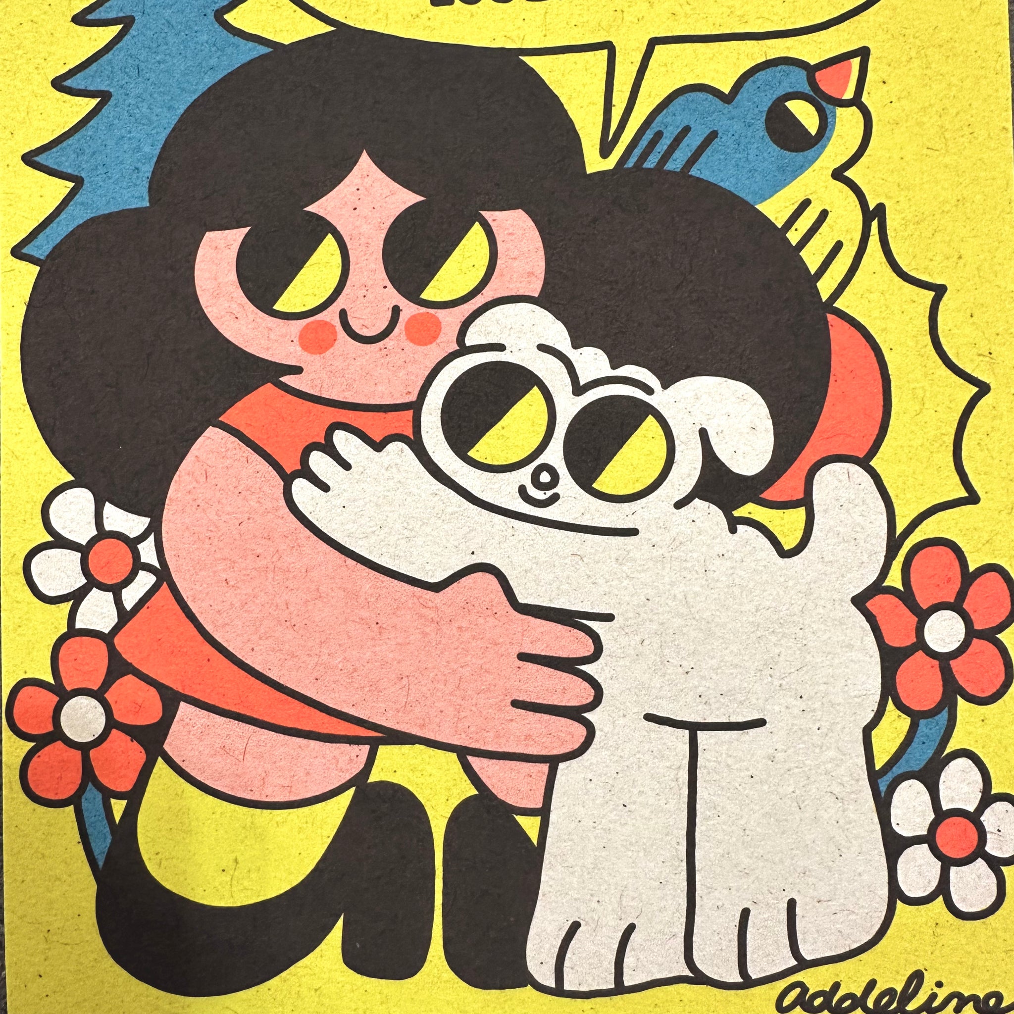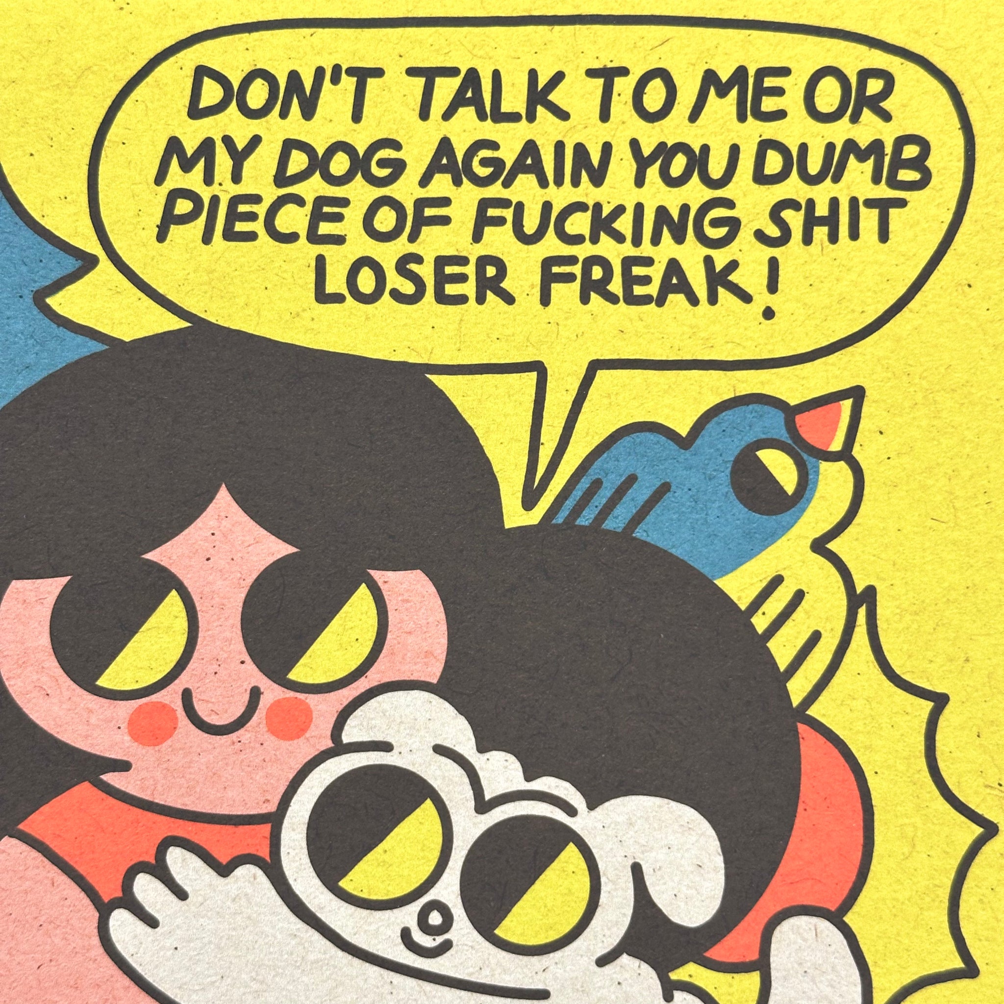 Bold, brash, and completely unapologetic — Don’t Talk to Me or My Dog is Addeline Griswold’s cult-favorite print that captures her signature blend of sweetness and snark. A wide-eyed girl hugs her dog protectively while unleashing a hilariously blunt message to the world. It’s pure Burger Babie energy: colorful, cute, and delightfully unfiltered.