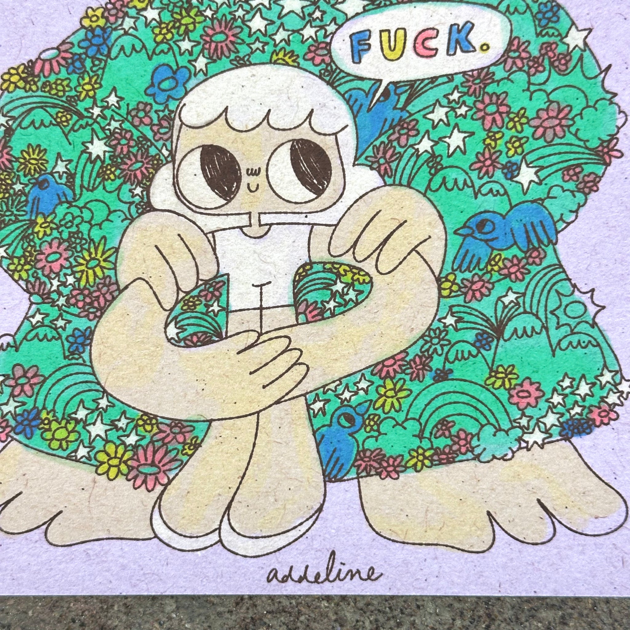The artwork features Addeline’s signature warm tones, thick-lined charm, and humor that toes the line between cute and confrontational. Printed on textured watercolor paper by Press Friends in Los Angeles, each giclée captures the tactile grain and saturated nostalgia of Addeline’s handmade originals.