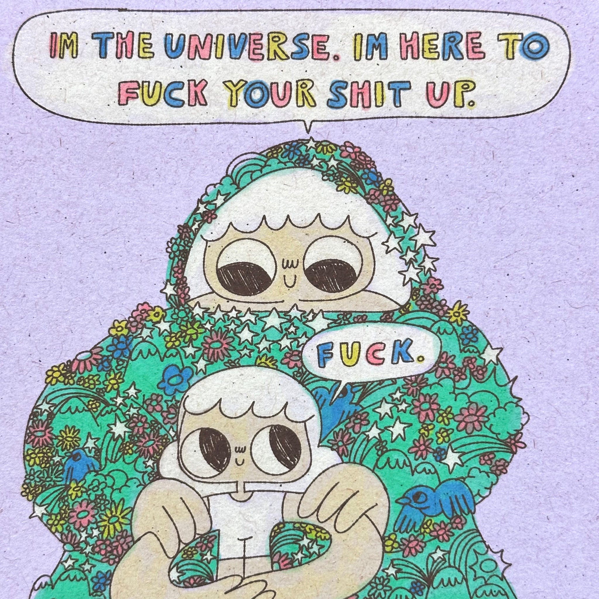 Addeline Griswold, the artist behind Burger Babie, continues her unapologetically bold and heartfelt storytelling with I’m the Universe, I’m Here to Fck Your Sht Up — a perfectly chaotic reminder that sometimes, the universe’s tough love is exactly what we need. Her signature vintage-inspired style meets cosmic absurdity in this piece, wrapping humor, honesty, and chaos into one perfectly defiant visual.