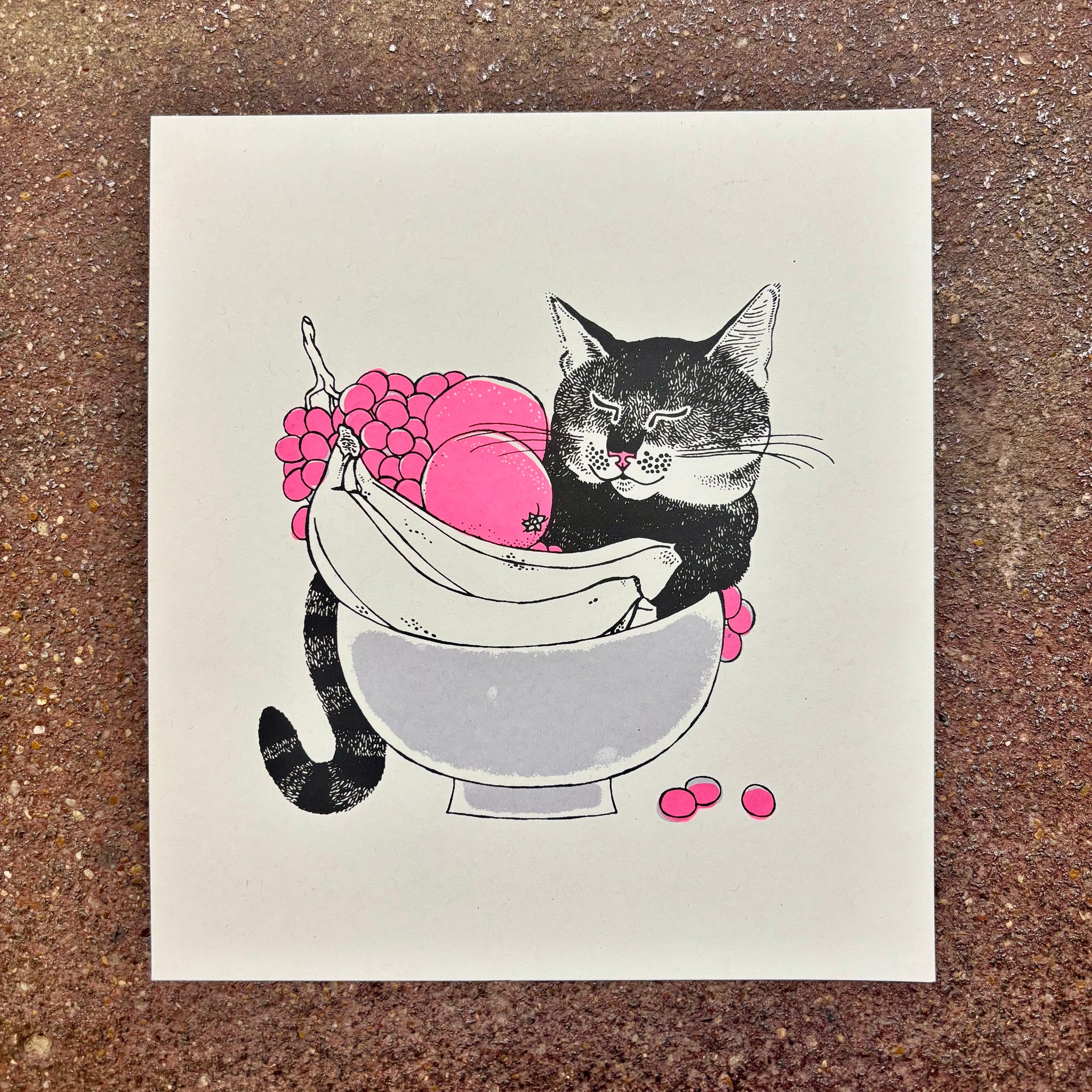 A very pleased black cat has claimed the fruit bowl as their personal throne, curling around bright pink grapes and a perfectly balanced banana. It feels like the exact moment you walk into the kitchen and realize the produce is no longer for humans. Daria Tessler’s Fruit Bowl Cat screen print is simple, funny, and a little bit fancy—perfect for cat people, kitchen walls, or anyone who loves quietly chaotic still lifes.