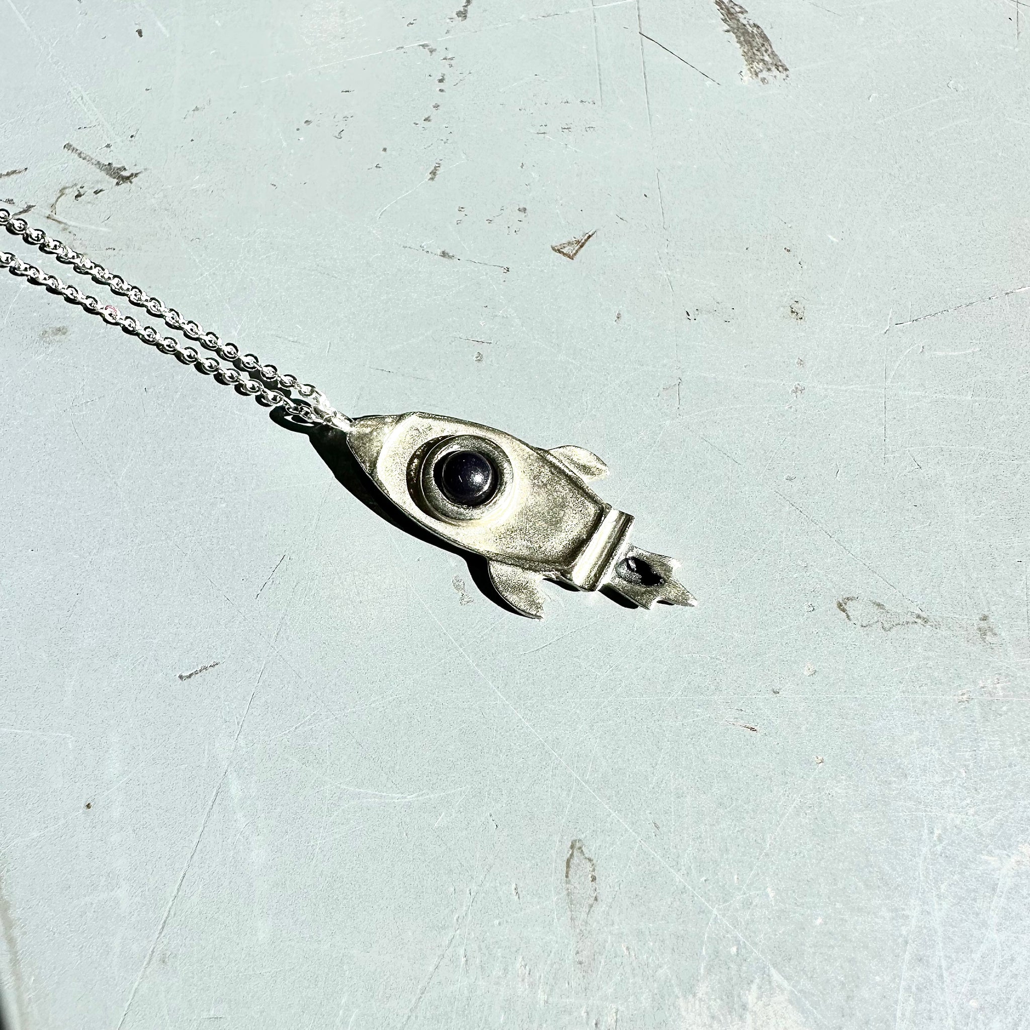 Handcrafted by artist Therese Kuempel in Chicago, this Rocket Necklace with Black Onyx captures both craftsmanship and curiosity. The pendant’s sleek, mid-century inspired rocket shape is cast in white bronze, a durable, tarnish-resistant metal that mirrors the appearance of sterling silver. At its center, a polished black onyx gemstone adds depth and contrast, making this piece as striking as it is timeless.