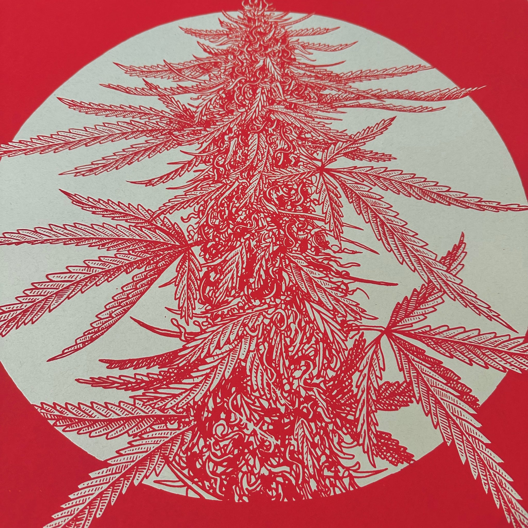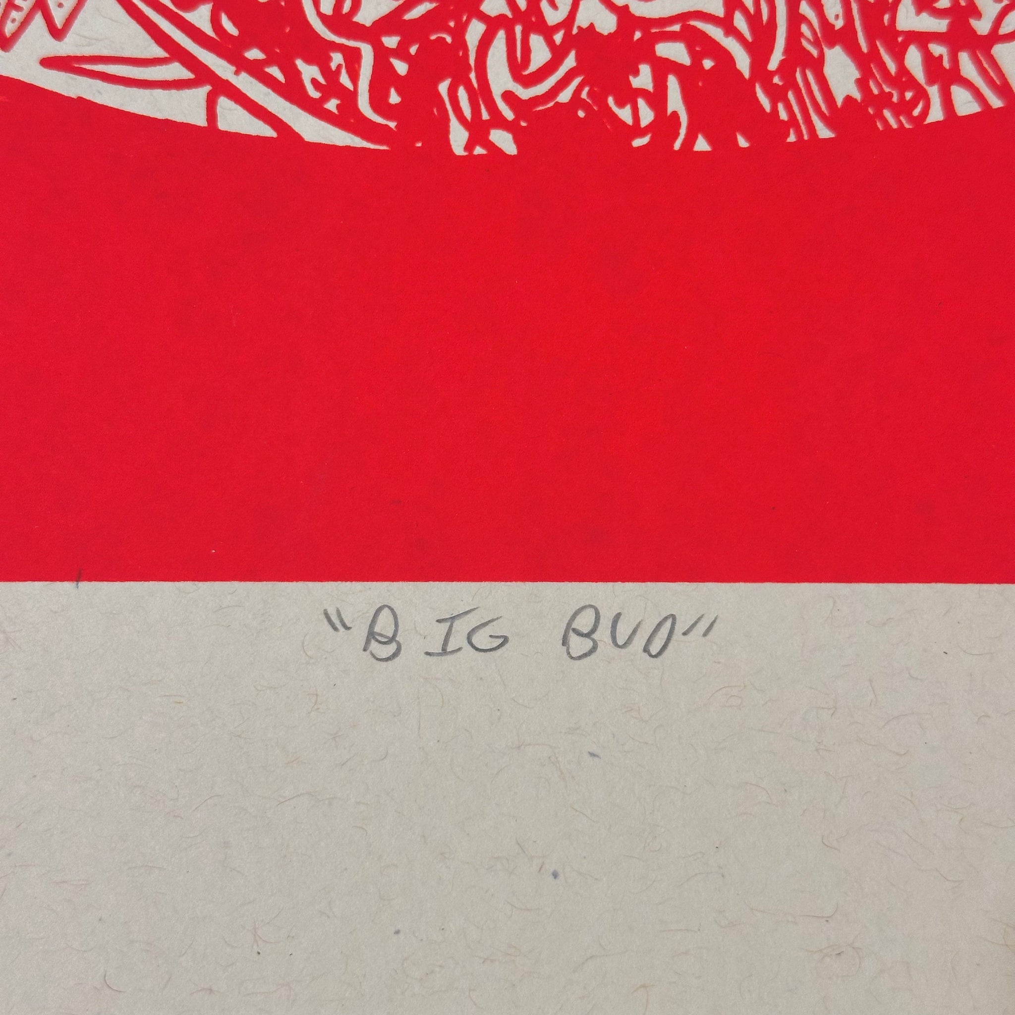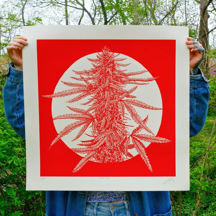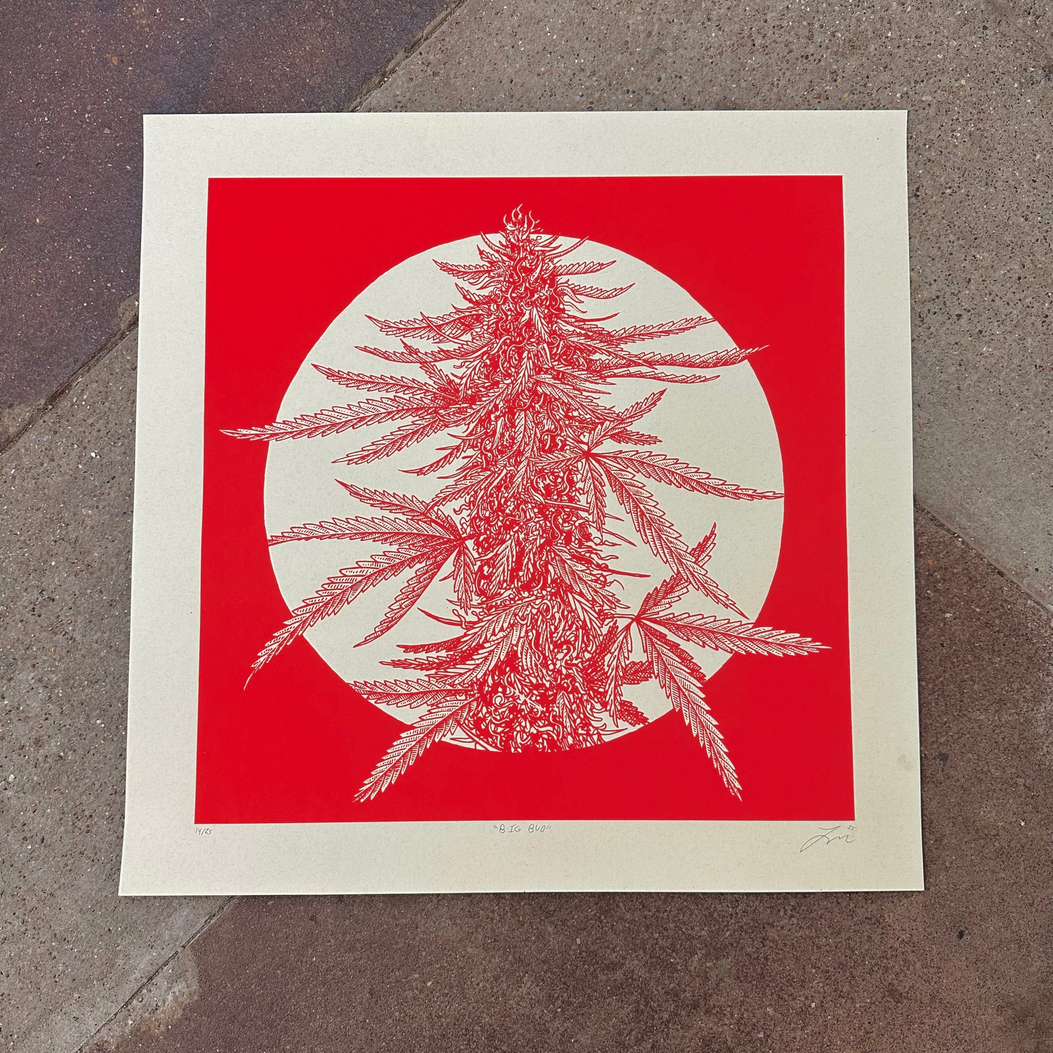 This one’s for the bold. Big Bud is a jumbo 24” x 24” one-color screenprint by Maryland-based artist Luke Martin. Printed on premium off-white French Paper, the “Panama Red” edition turns heads with its high-contrast red ink and massive central silhouette. It’s cheeky, graphic, and meant to make a statement—but not be taken too seriously.