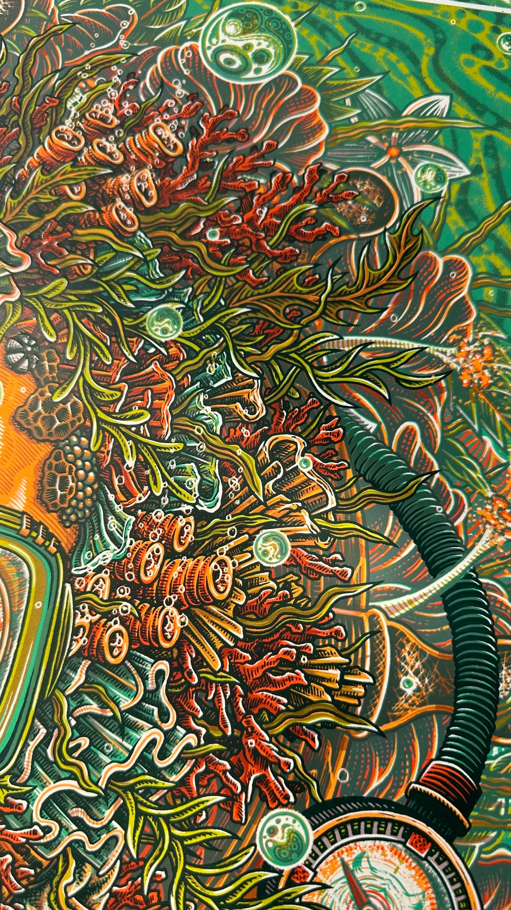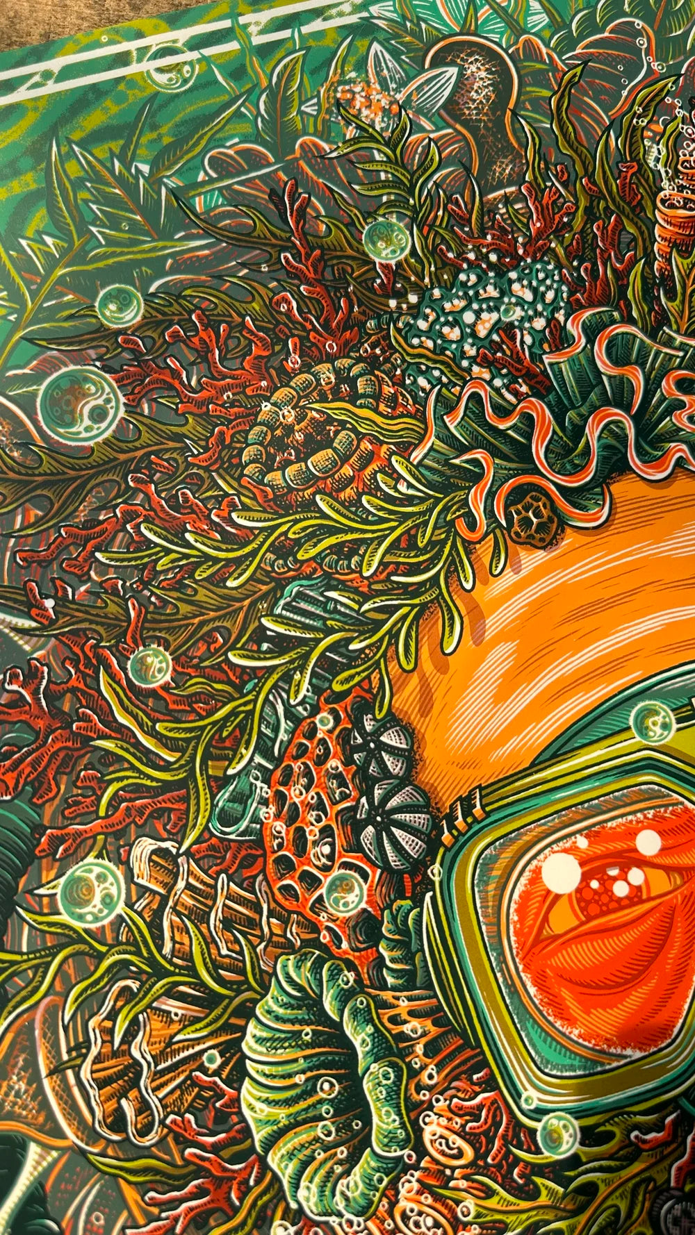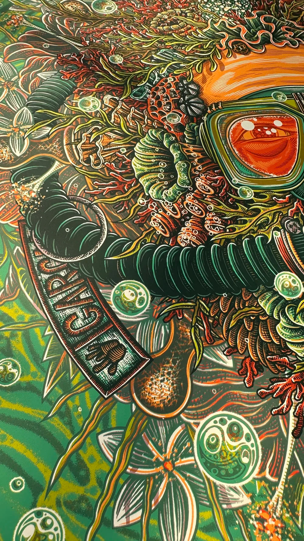 Submerge into the psychedelic underwater world of Jerry Garcia, reimagined through Luke Martin’s intricate illustration work. “Kona Ripple – Touch of Green” is a 7-color screenprint bursting with detail—from coral reef curls of hair to goggle lenses glowing with sonic memories. Printed by Broken Press in Seattle, WA, this artist variant pulses with lush green tones and a surreal deep-sea energy that honors both nature and music in perfect harmony.