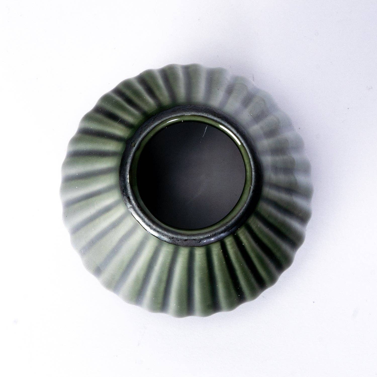 • Finish / Glaze: Glossy dark green with vertical ribbed texture