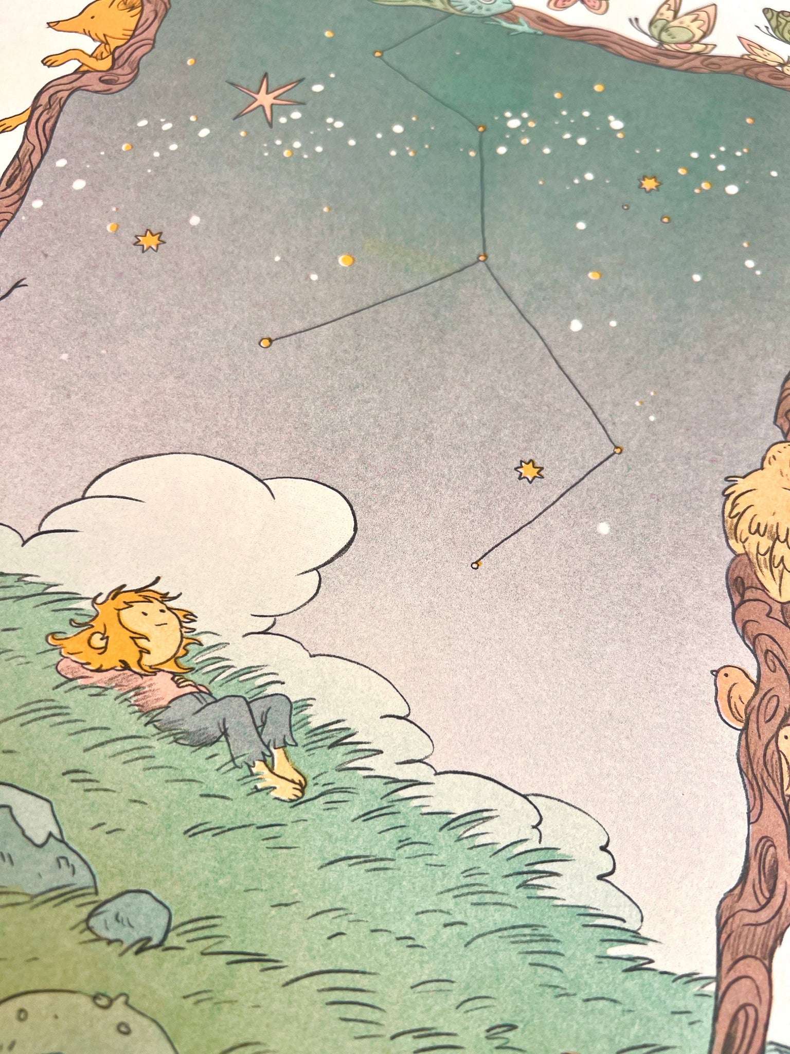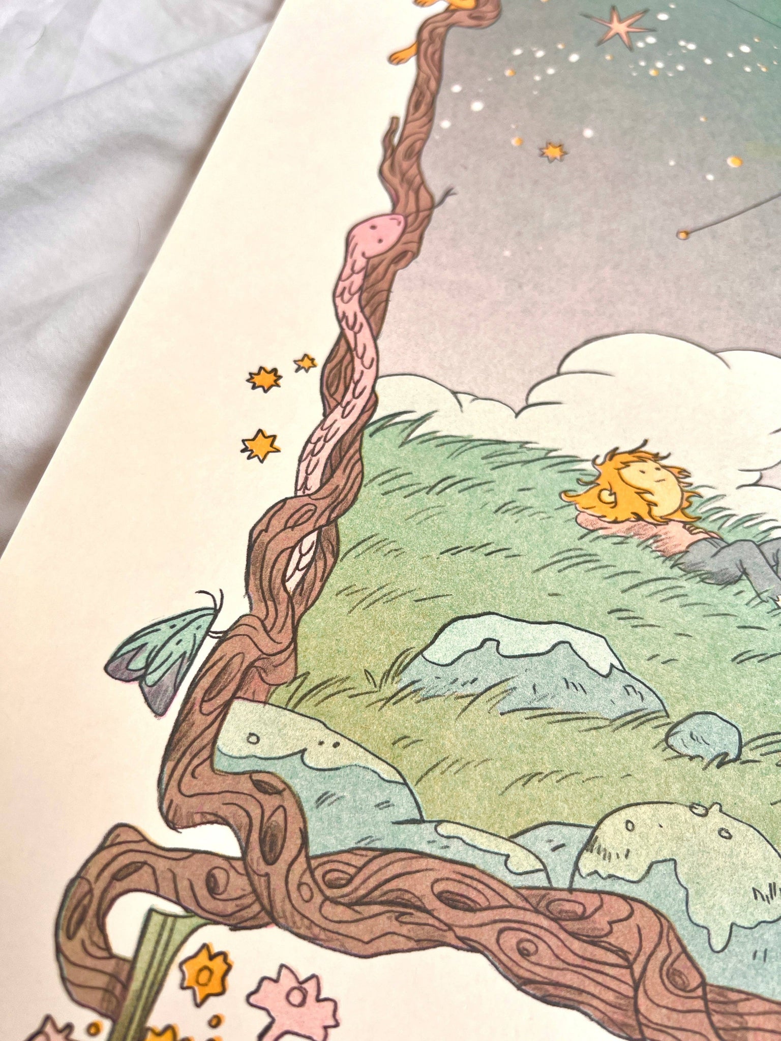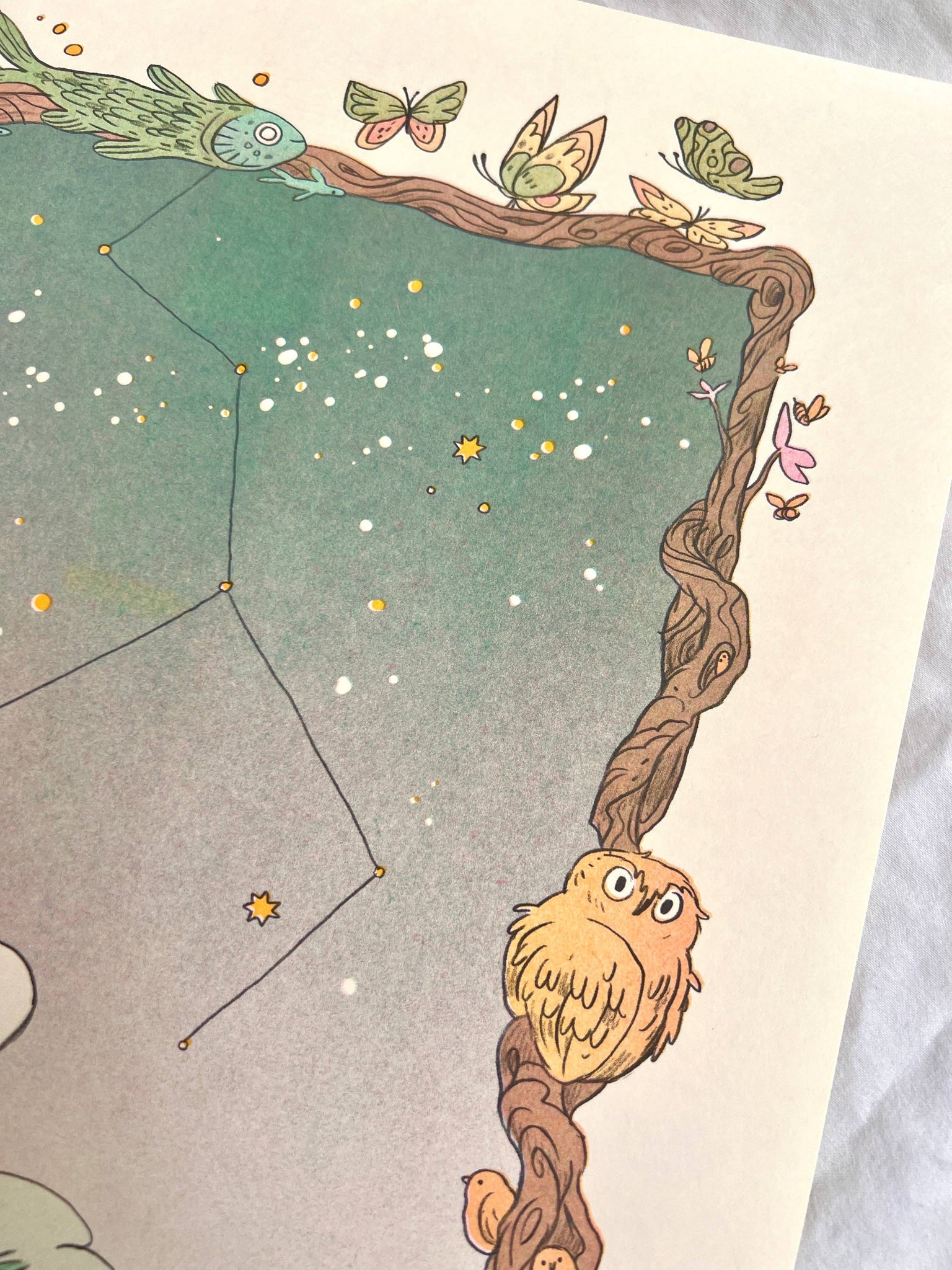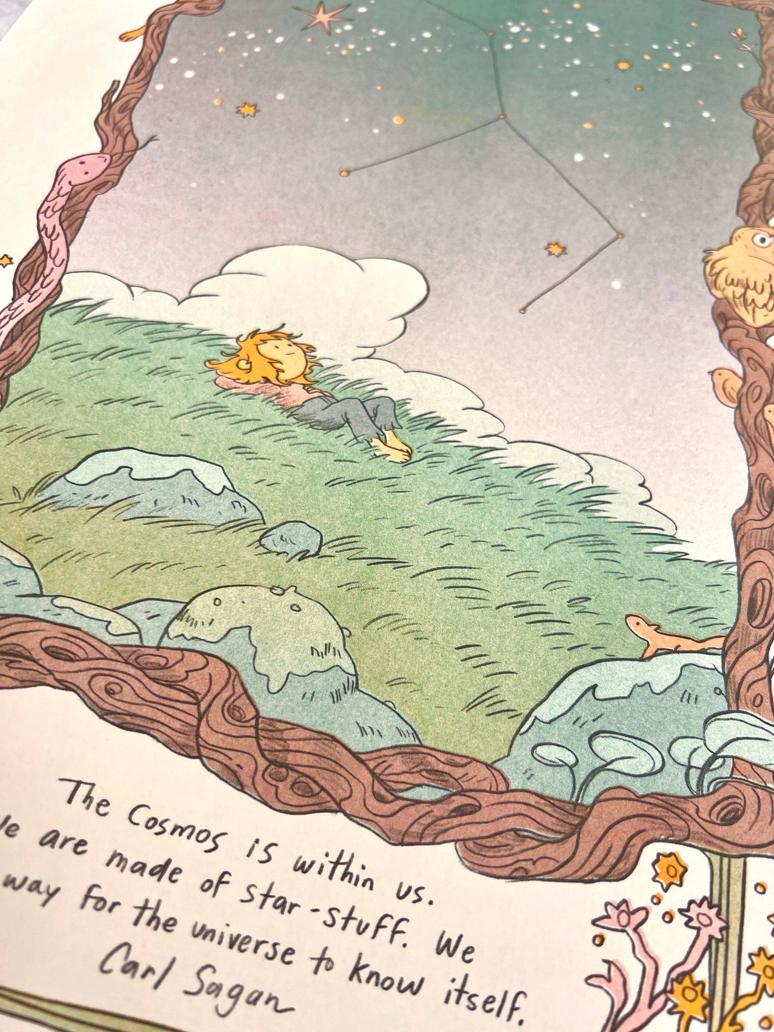 Gaze up, drift off, and dream among the stars. This enchanting 4-color risograph print is a heartfelt tribute to Carl Sagan’s words and the story of Contact. Surrounded by curious critters and constellations, a peaceful stargazer reminds us that we are made of the same magic as the cosmos.