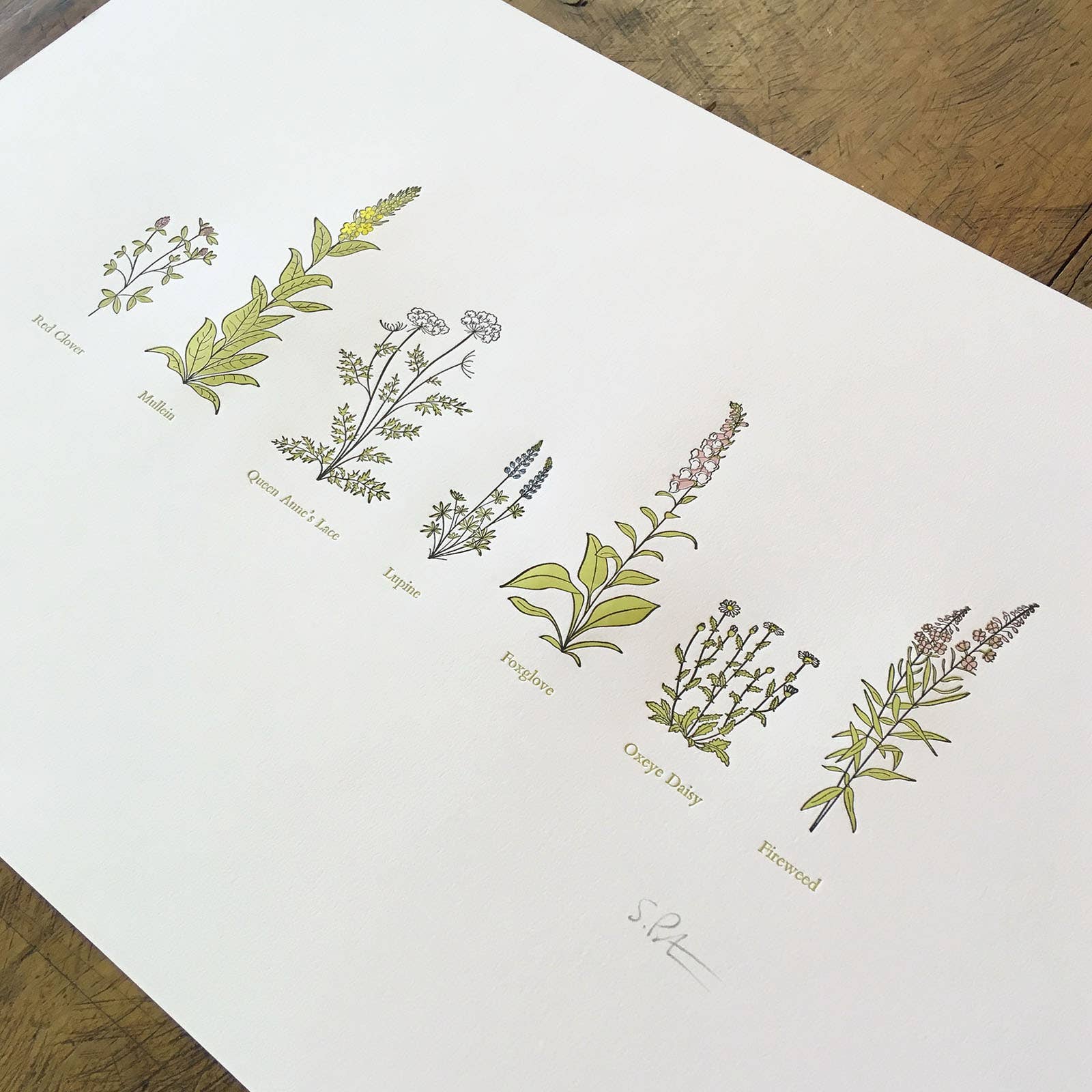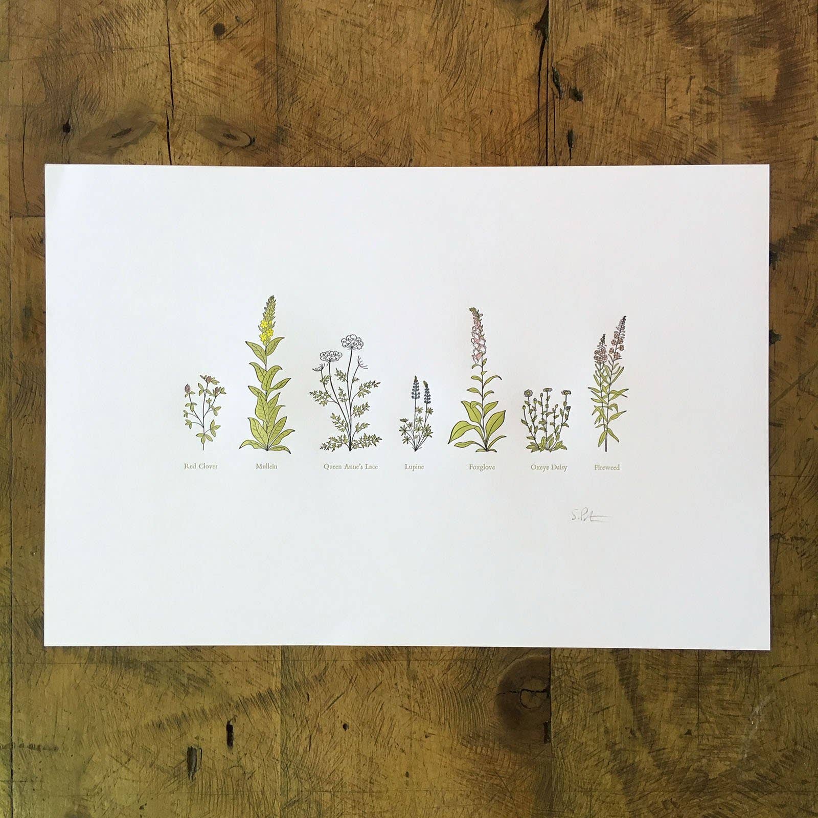This letterpress print by Susan Porteous of Green Bird Press gathers a handful of wildflowers you might spot growing along Oregon roadsides. Printed by hand on a vintage press, each flower is illustrated with clear, minimal lines and soft layers of green, pink, yellow, blue, and black inks. Featuring red clover, mullein, Queen Anne’s lace, lupine, foxglove, oxeye daisy, and fireweed, the print feels like a field guide distilled into a clean, modern composition. It’s an ideal piece for gardeners, hikers, and anyone who loves delicate botanicals paired with the tactile beauty of letterpress.