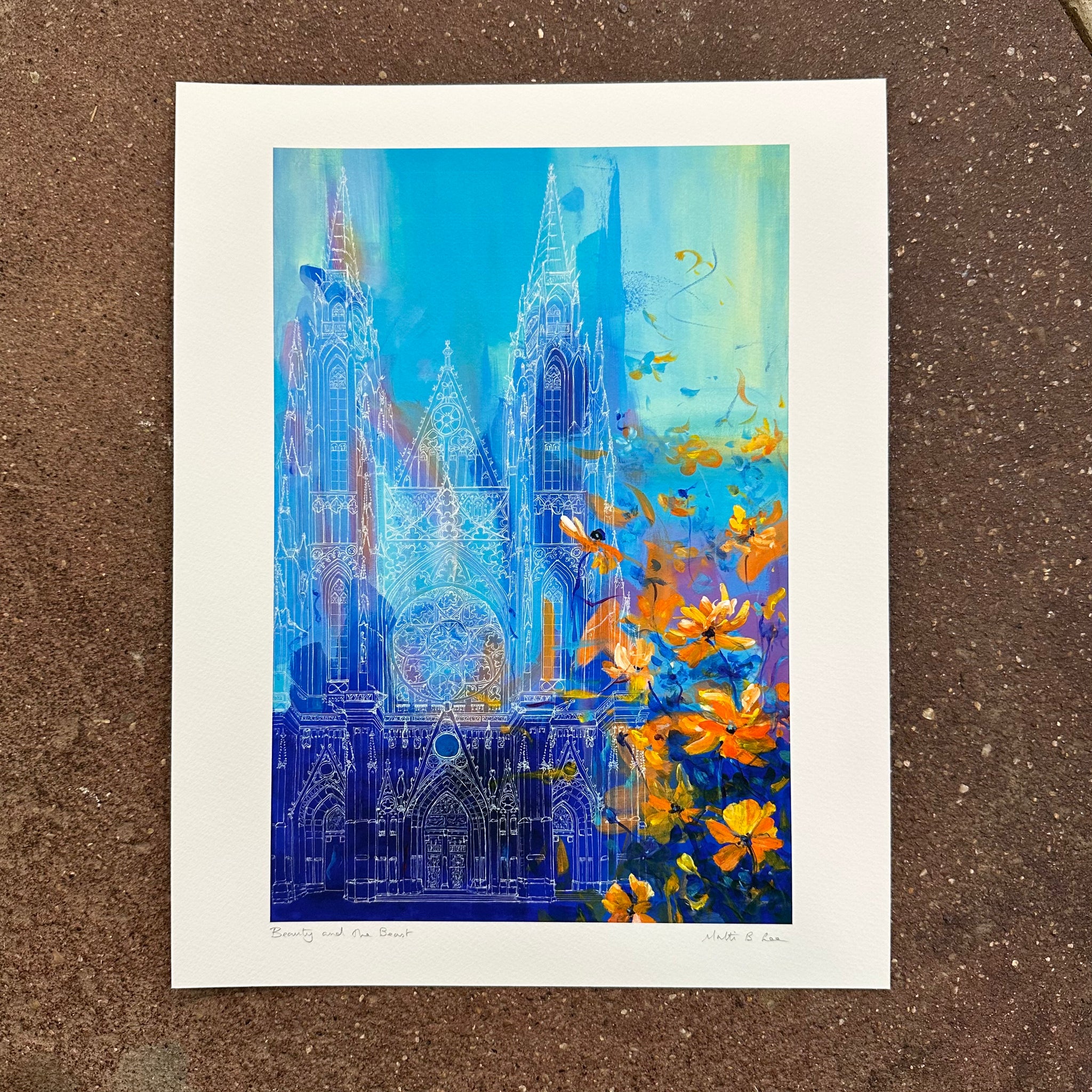 Inspired by a childhood visit to the St. Vitus Cathedral in Prague Castle, Beauty and the Beast captures the awe and imagination of first encounters with grand, gothic architecture. Malti remembers the skies being heavy with clouds and the cool air wrapping around her as she wandered through the castle complex and approached the towering spires of the cathedral. To her young eyes, it felt like stepping into a story — where the cathedral stood as the looming Beast, and the light and flowers she’s now painted in represent the Beauty.