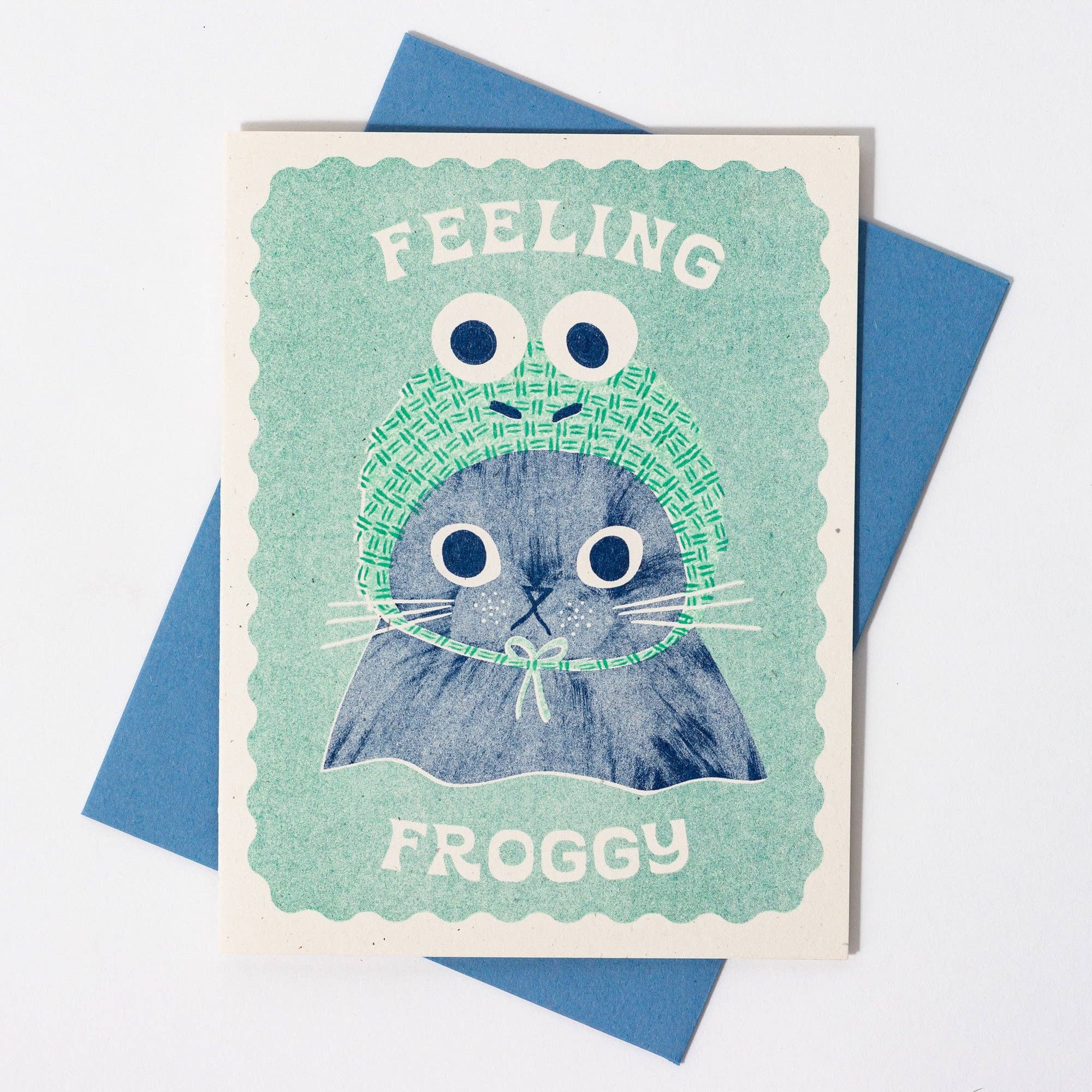 A wide-eyed kitten in a cozy knit frog hat peers out with the biggest googly eyes you’ve ever seen. Equal parts absurd and adorable, this silly card is perfect for “just because” moments. Risograph printed in federal blue and seafoam ink with a playful scalloped border.