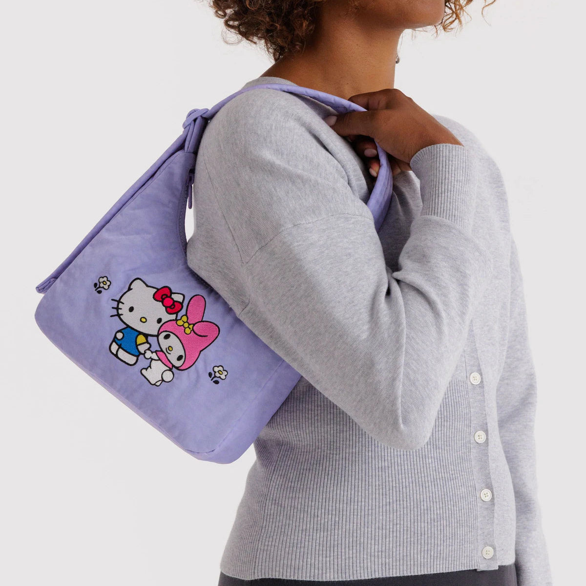 Bring a little sweetness wherever you go with the Embroidered Hello Kitty & My Melody Mini Shoulder Bag. This soft lilac bag features Hello Kitty and My Melody holding hands, surrounded by tiny embroidered flowers — a heartwarming design that blends Sanrio nostalgia with Baggu’s modern minimalism.