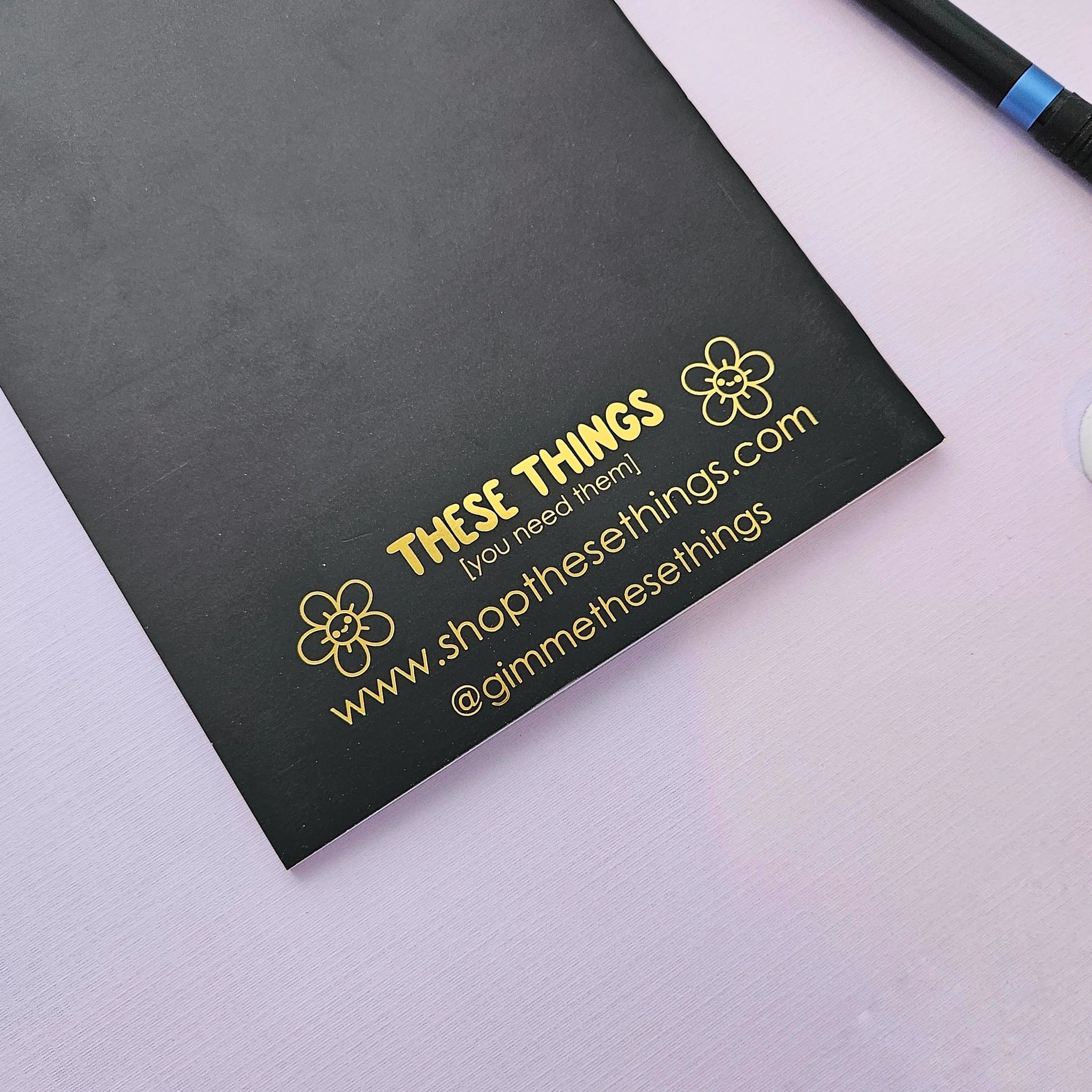 Summon your most magical ideas with this Spells Cat Notebook, featuring a curious black cat in a star-covered cape perched beside a flickering candle. Printed in shimmering gold foil, this design brings just the right amount of witchy charm to your desk or bag — perfect for jotting down notes, doodles, or secret spells.