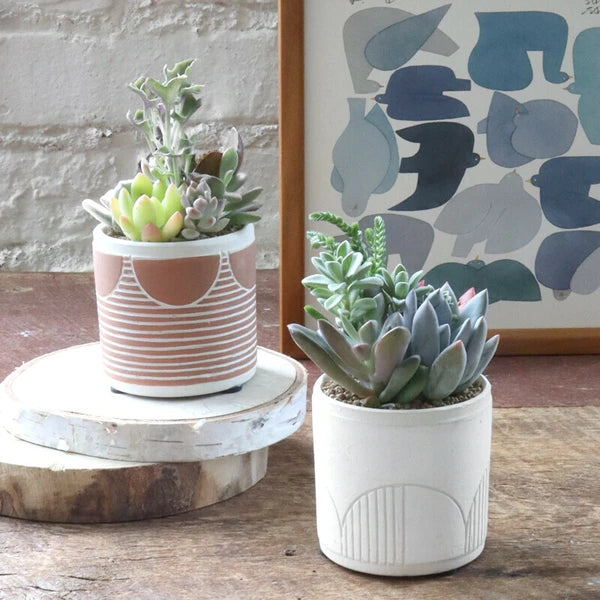 This compact ceramic planter features a warm terracotta base with hand-carved white stripes and half-moon arches for a minimal, sun-washed look. Perfect for small succulents or cuttings, it brings a soft, earthy charm to any windowsill or workspace.