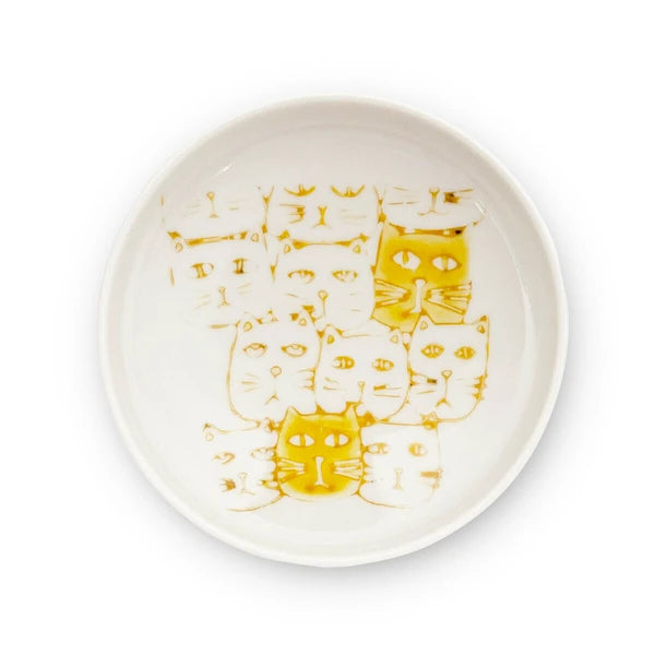 A whole crowd of curious cats, all squeezed onto one tiny plate. This Hasami-yaki small dish features a stack of yellow kitty faces peeking up from the center—like they’re watching your snacks, soy sauce, or jewelry with great interest. Cute on its own, even better stacked with other colors on your table or counter.