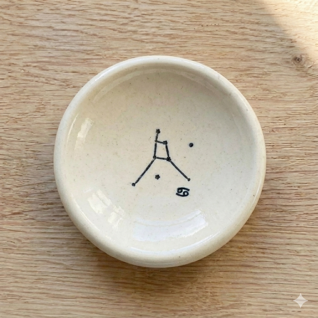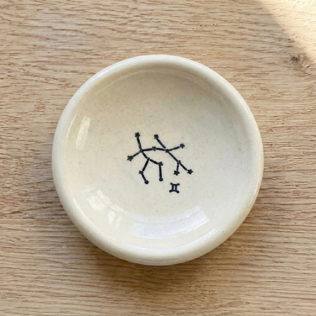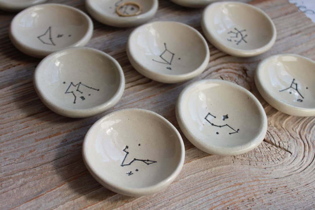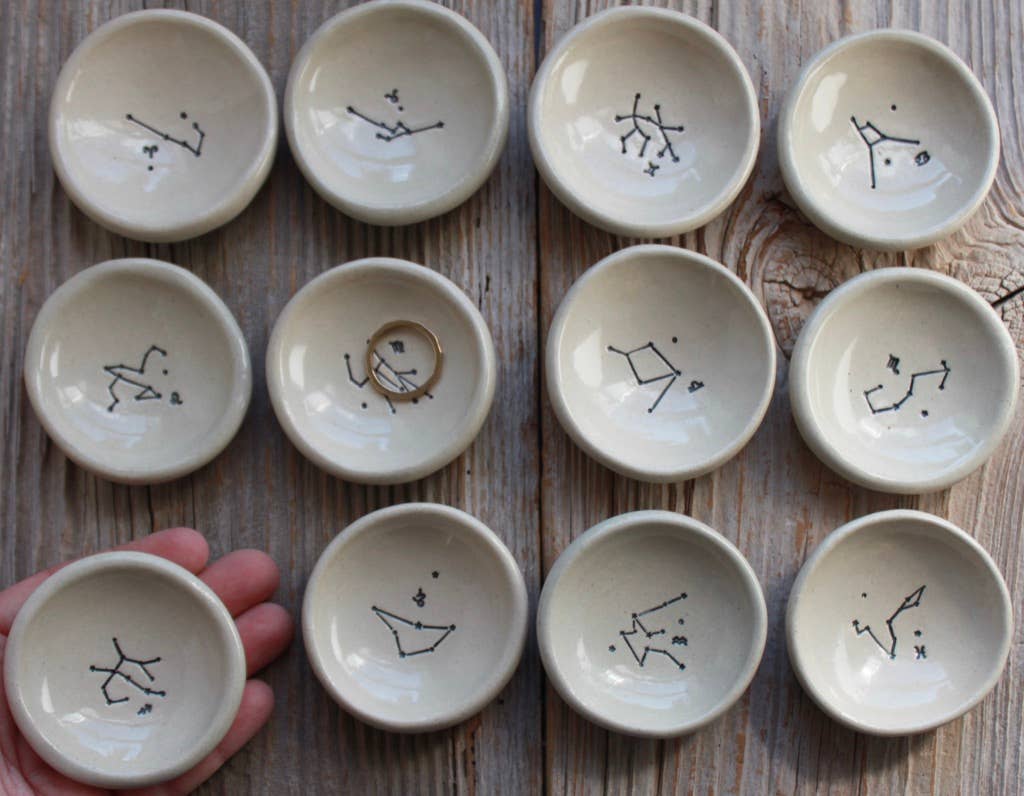 A quiet little place for your most meaningful things. This handmade zodiac constellation ring dish by Virginia-based ceramic artist Tasha McKelvey is designed to hold rings, earrings, or small keepsakes while adding a subtle, celestial touch to your space. Each dish is hand-formed and finished individually, featuring a minimalist constellation illustration tied to your zodiac sign—simple dots and lines that feel both personal and timeless.