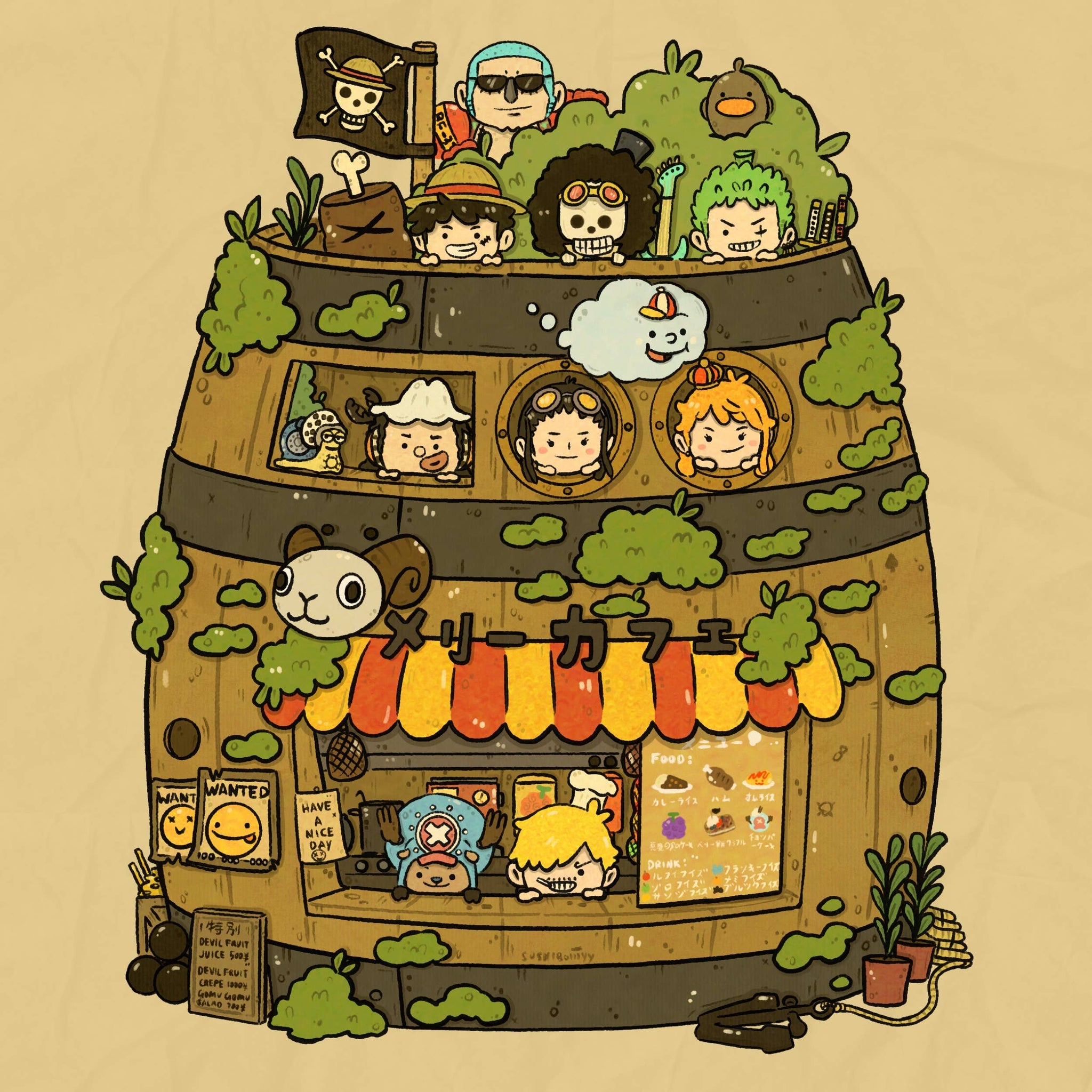 Ahoy there, sweet-toothed pirates! Drop anchor at the most charming café on the Grand Line—tucked inside a giant wooden barrel and run by the Straw Hat Crew themselves. With Luffy taking orders, Chopper working the counter, and Sanji whipping up fruity drinks, this adorable little hideout is full of personality, cozy vibes, and moss-covered cuteness.