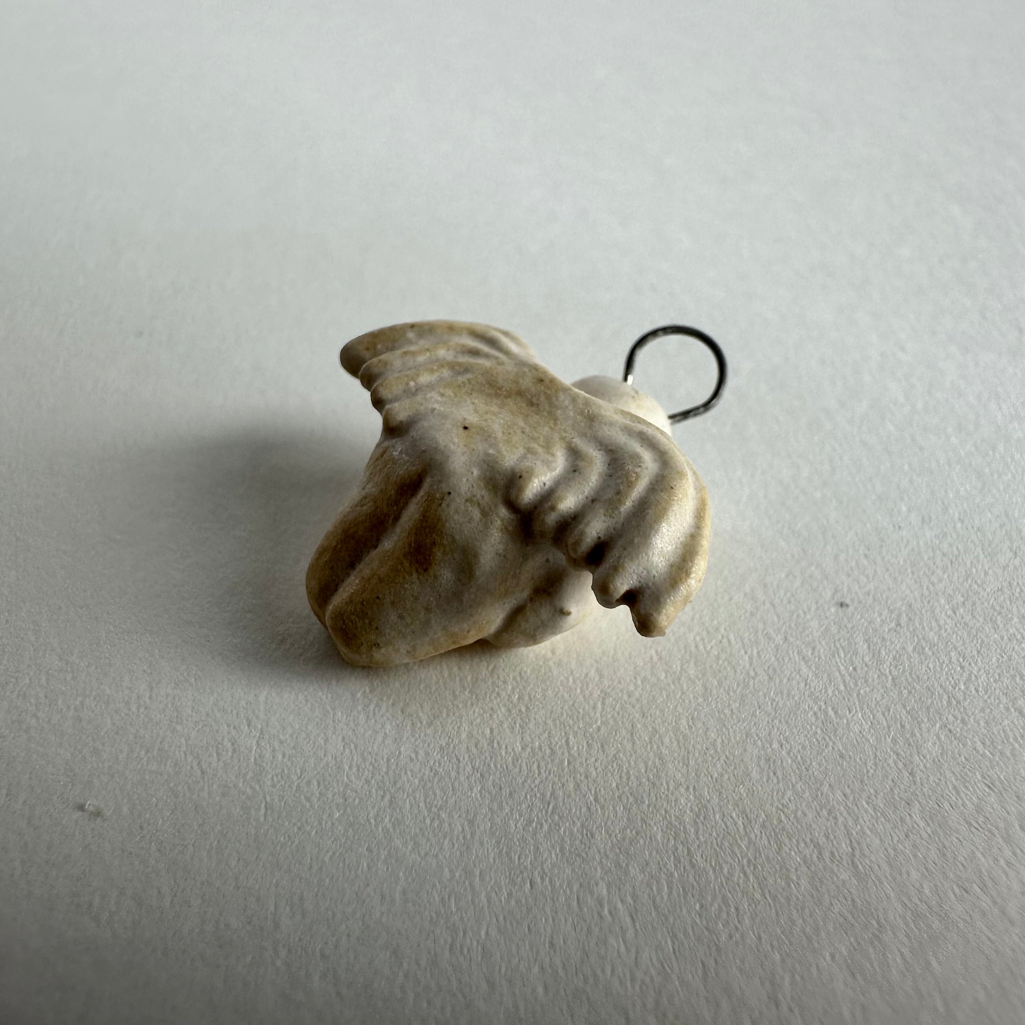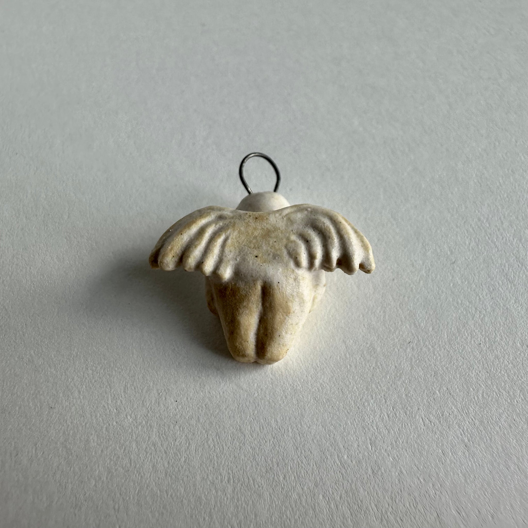 The figure is sculpted with outstretched wings and a rounded body, creating a balanced shape that feels both delicate and grounded. The stoneware surface is finished in a soft cream tone with subtle texture and natural variation, emphasizing the handmade character of the piece. A small metal loop sits at the top, allowing it to be easily threaded onto a cord, chain, or ribbon.
