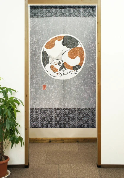 A cat nap, frozen in time! This adorable noren curtain features a cozy calico cat curled into a perfect circle—dreaming away on a soft gray background with a traditional Japanese pattern. Whether it’s for your kitchen, hallway, or studio nook, this curtain brings instant charm and a hint of feline zen to any space.
