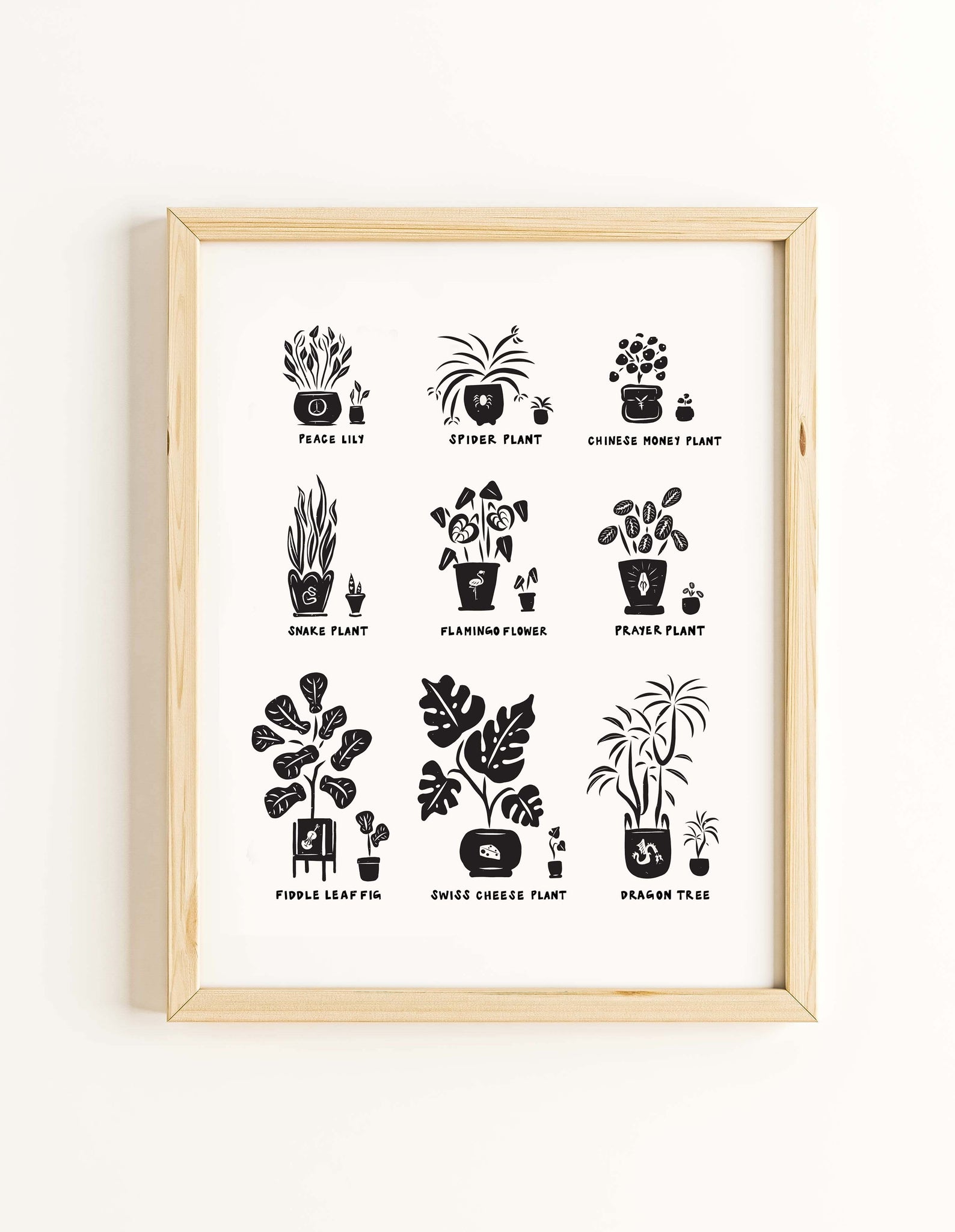 Meet the cutest plant gang around. This print features a black-and-white digital illustration of adorable indoor houseplants — from tiny succulents to leafy friends — all lined up and ready to brighten your wall. Printed on white uncoated 100# cover paper, each print is neatly packaged with a backing board inside a clear plastic sleeve so it arrives crisp and ready to frame or gift.