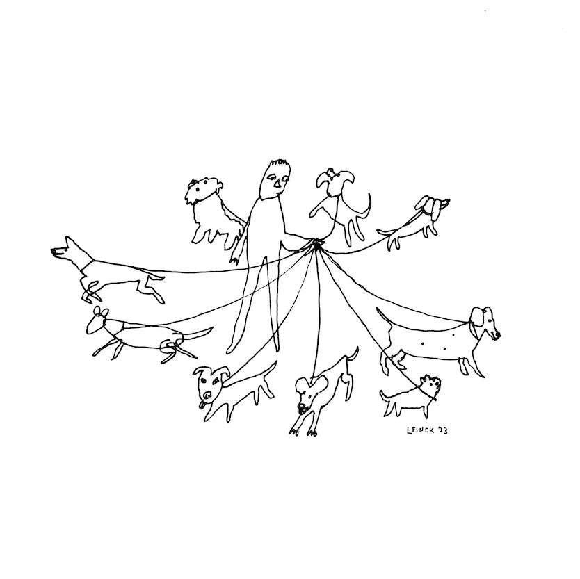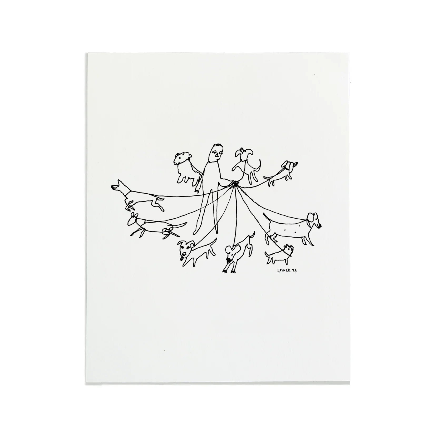 Liana Finck’s “Dogwalker” captures the delightful chaos of city life in her unmistakable line-drawn style. A tangle of dogs, leashes, and one very patient walker come together in this playful, slightly absurd scene — the kind of everyday moment she turns into something quietly hilarious and instantly relatable. Printed with a deep letterpress impression, every line has texture and presence, giving the artwork a tactile quality that feels just as charming in person as it does on the page.