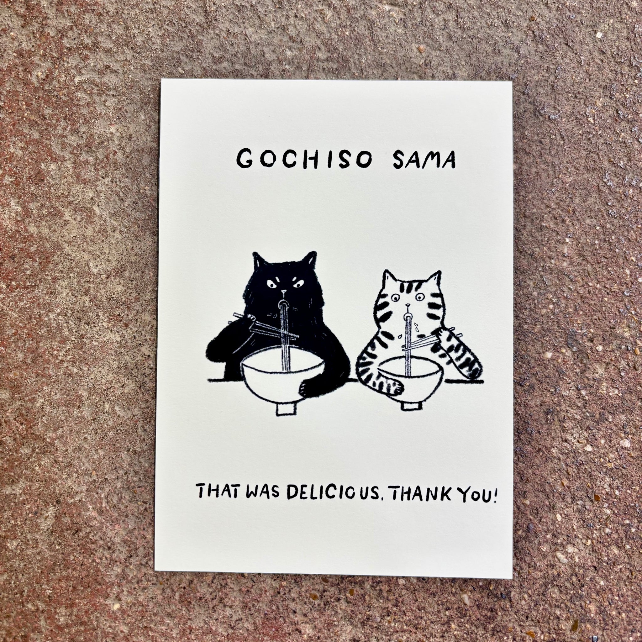 Two cats, empty bowls, and a full heart — this mini print celebrates Gochisosama, the Japanese phrase said after a meal to give thanks (“That was delicious. Thank you!”). It doubles as a postcard and makes a sweet reminder of gratitude, perfect for your kitchen wall, dining nook, or a thoughtful note to a friend.