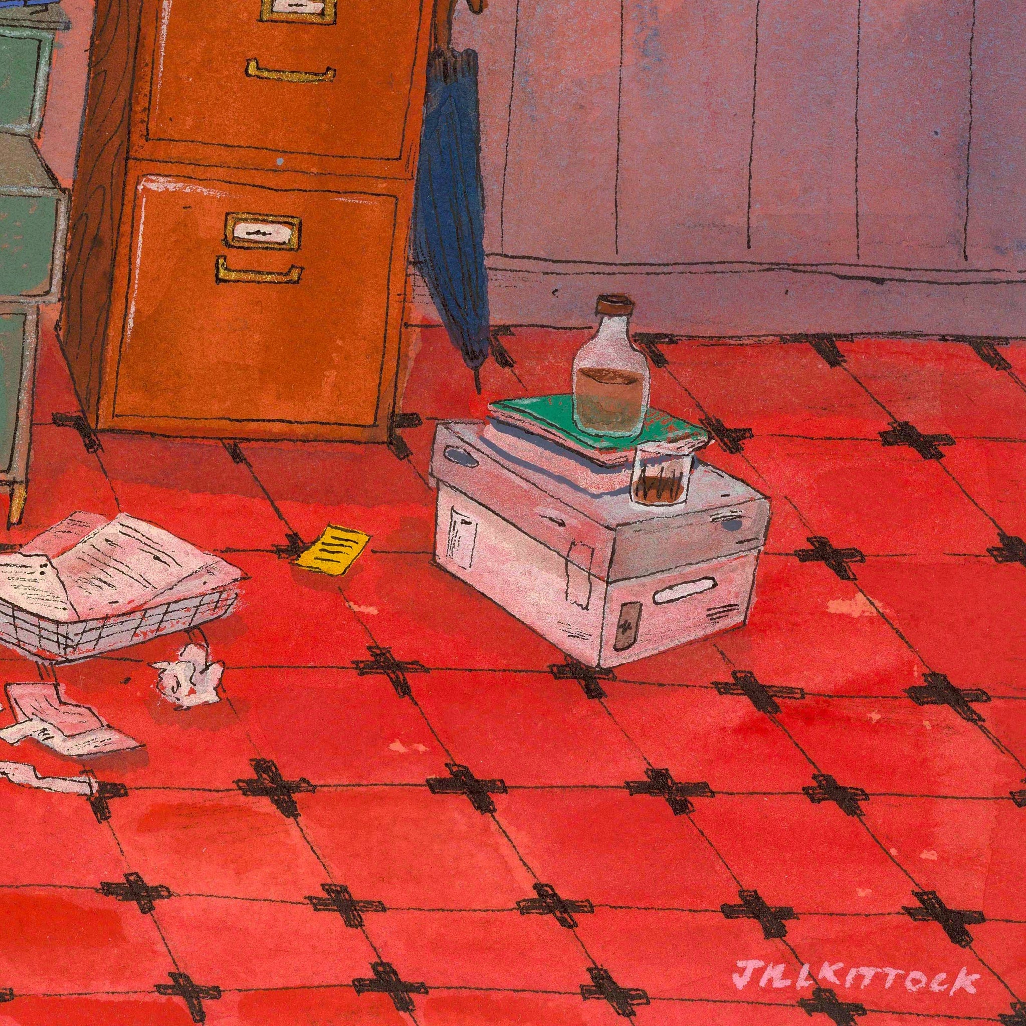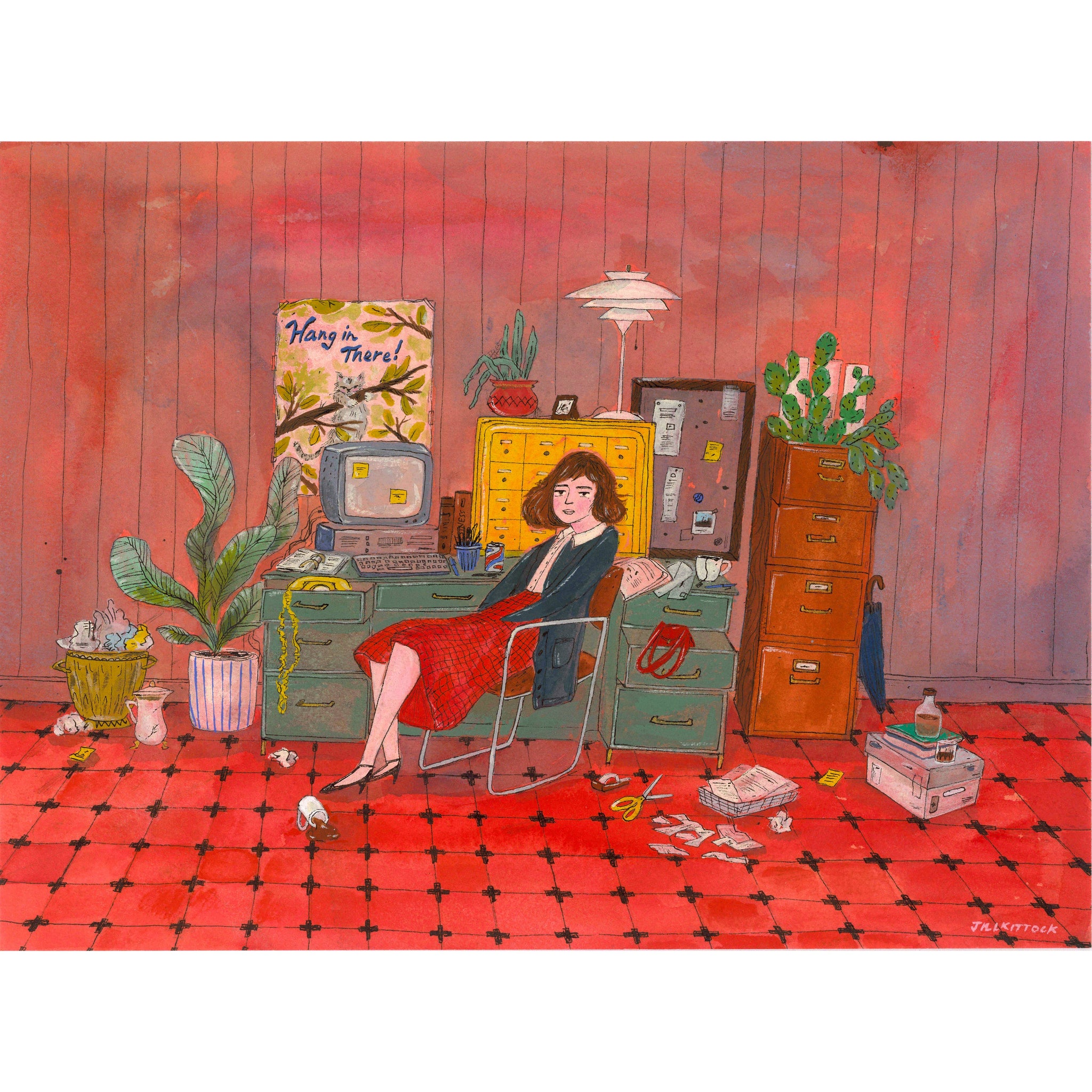 Jill Kittock’s Hang in There! is every chaotic workday captured in one perfectly disheveled scene. It’s the kind of office where the deadlines are blurry, the trash is definitely overflowing, and the motivational poster on the wall is doing its best to keep morale alive. Brightly colored and full of tiny, expressive details, this print turns everyday burnout into something oddly comforting — a reminder that we’ve all been here, hanging on with a lukewarm cup of coffee and the best intentions.