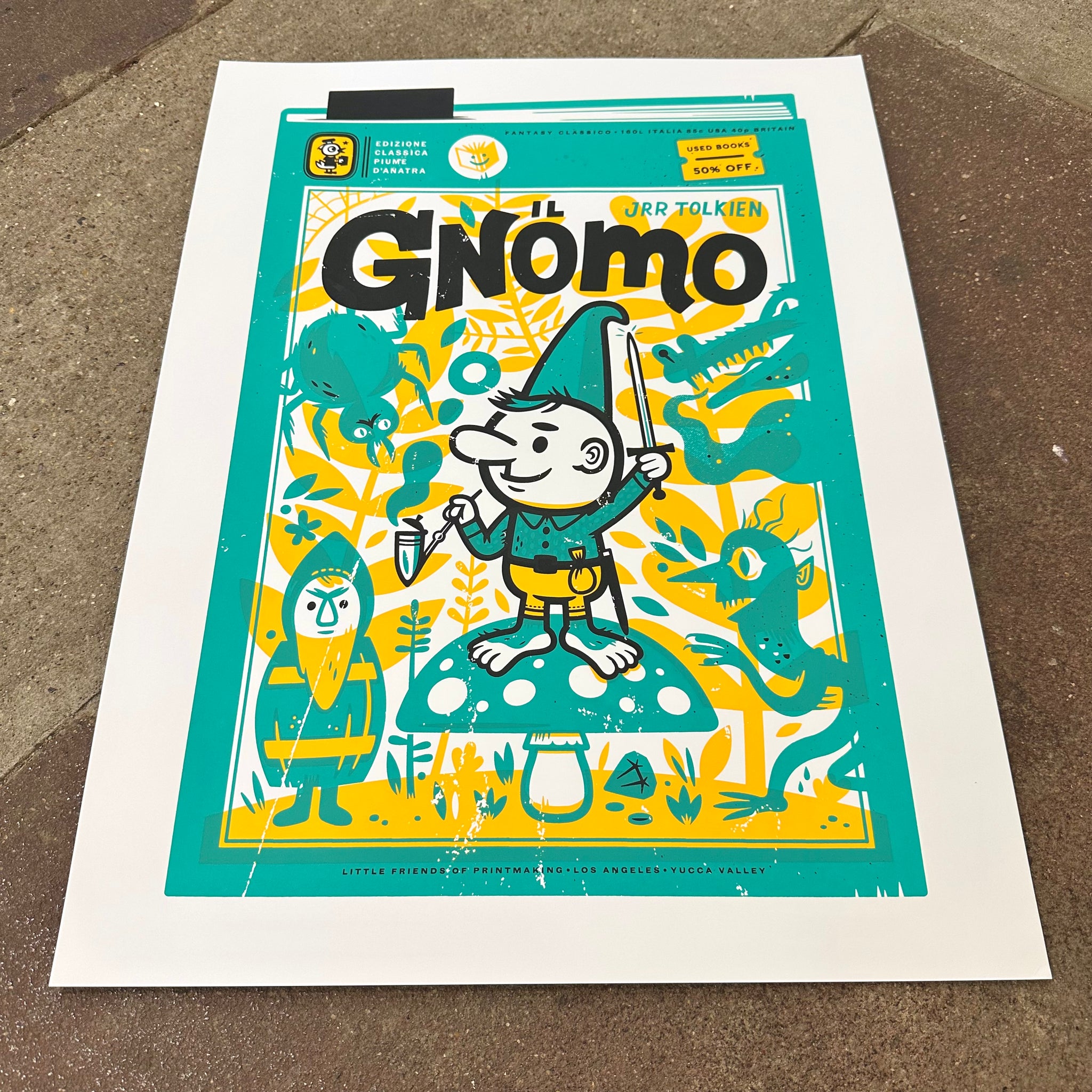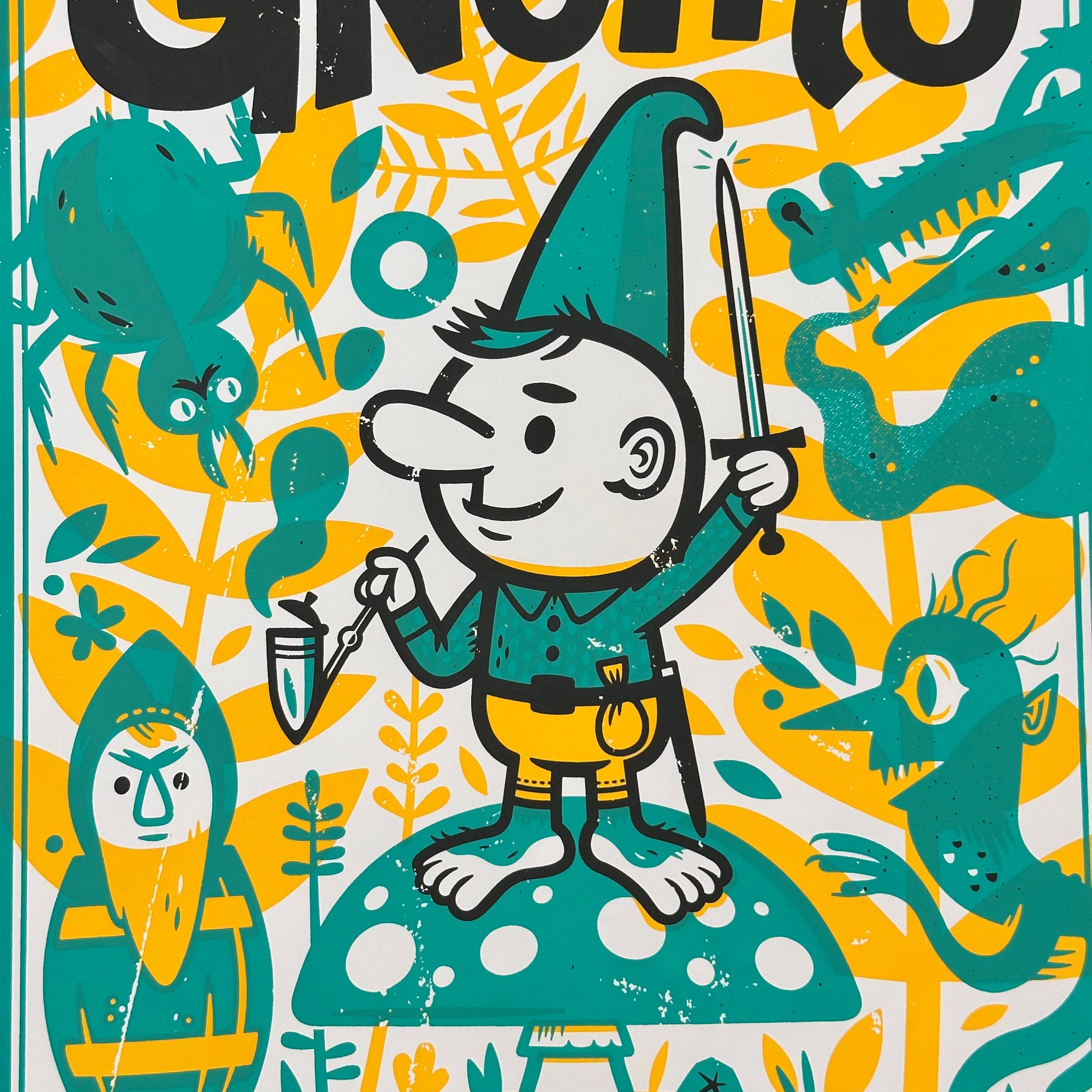 Somewhere between a vintage fantasy paperback and a fever dream, Il Gnomo invites you into a world of mischievous adventure and old-school charm. Styled like a worn-in Italian book cover, this silkscreen print stars a plucky gnome hero standing proudly atop a mushroom, sword in one hand and a pipe in the other — surrounded by curious forest creatures and mysterious shapes. With its bold greens, mustard yellows, and hand-drawn typography, this piece feels like a forgotten classic pulled from the back shelf of an imaginary bookstore.