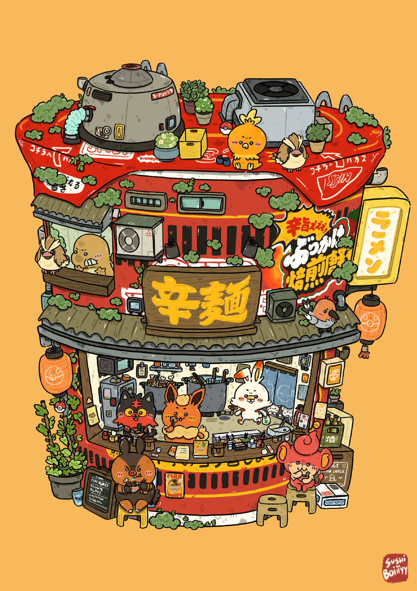 A tiny universe built inside a bowl of spice. This 4 x 6 art print imagines a poke-store world stacked high—lanterns glowing, steam rising, little characters tucked between signs and simmering pots. It feels like stumbling upon your favorite late-night spot, the one that hums with warmth and heat long after everything else has closed.