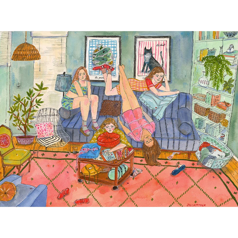 The scene unfolds with all of Jill’s signature charm: soft patterns layered over terracotta tiles, mismatched socks, gummy bears scattered across the carpet, a dog-eared paperback, and a half-open laundry basket that’s definitely been sitting there for days. Every detail feels lived-in and real, like you’ve walked into a moment frozen between conversations — nothing dramatic, nothing curated, just the quiet comfort of being around people who know you well enough not to clean up first.