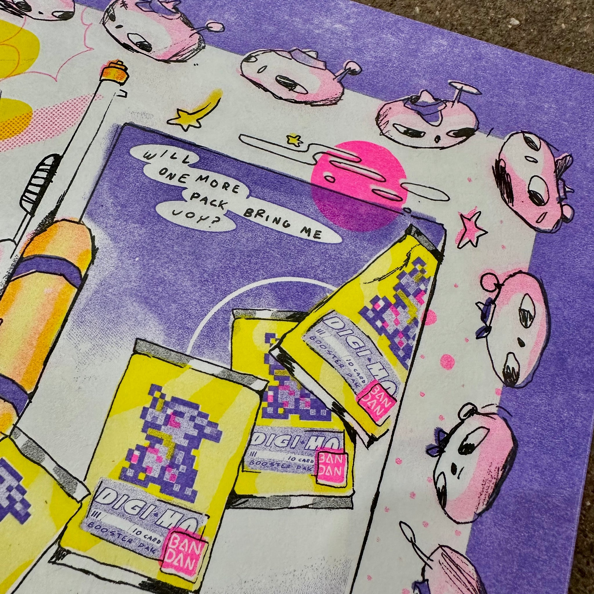 A celebration of the thrill of the draw! This bright and busy print captures that giddy rush of cracking open a mystery pack—whether it's trading cards, toys, or just the perfect surprise. With its energetic composition, bold neons, and fun breakfast table chaos, this piece is a love letter to the art of collecting and those lucky pulls that make your day.