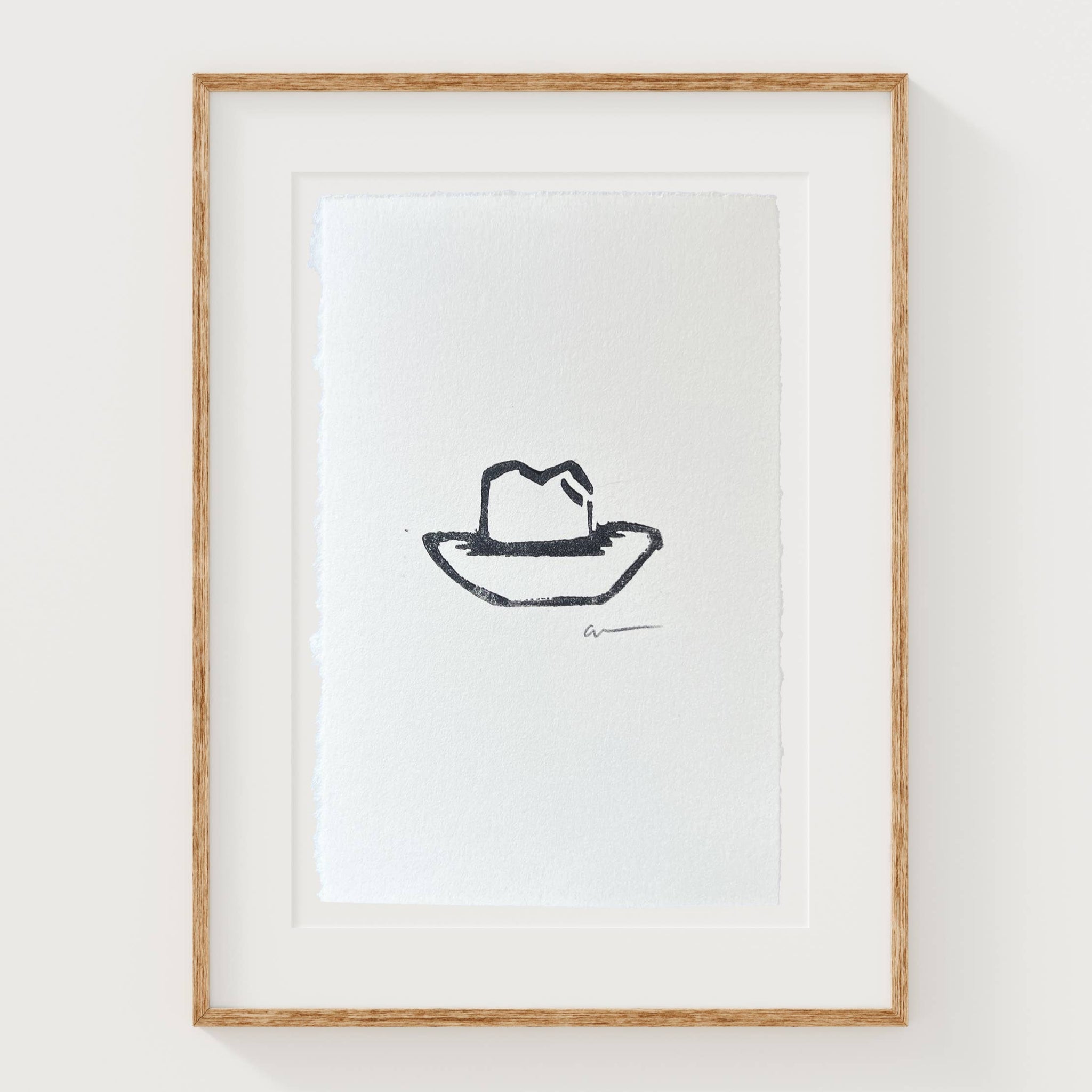 Tiny but mighty, this 4×6″ hand-carved linocut print features a lone mini cowboy hat — perfect for anyone with a soft spot for the Wild West (or just a good hat). Each print is individually hand-inked and pressed with black oil-based ink on Warm White Stonehenge paper, then signed by the artist. Because each one is made by hand, every print has its own little quirks in color and texture.