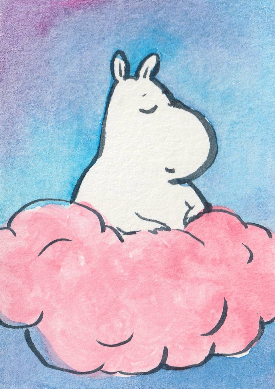 Peaceful and soft as a dream, Moomin On A Cloud floats in a sky of blue and pink, where calm and comfort meet. This miniature print captures a gentle, serene Moomin moment — eyes closed, resting on a fluffy cloud, lost in thought (or maybe just a nap).