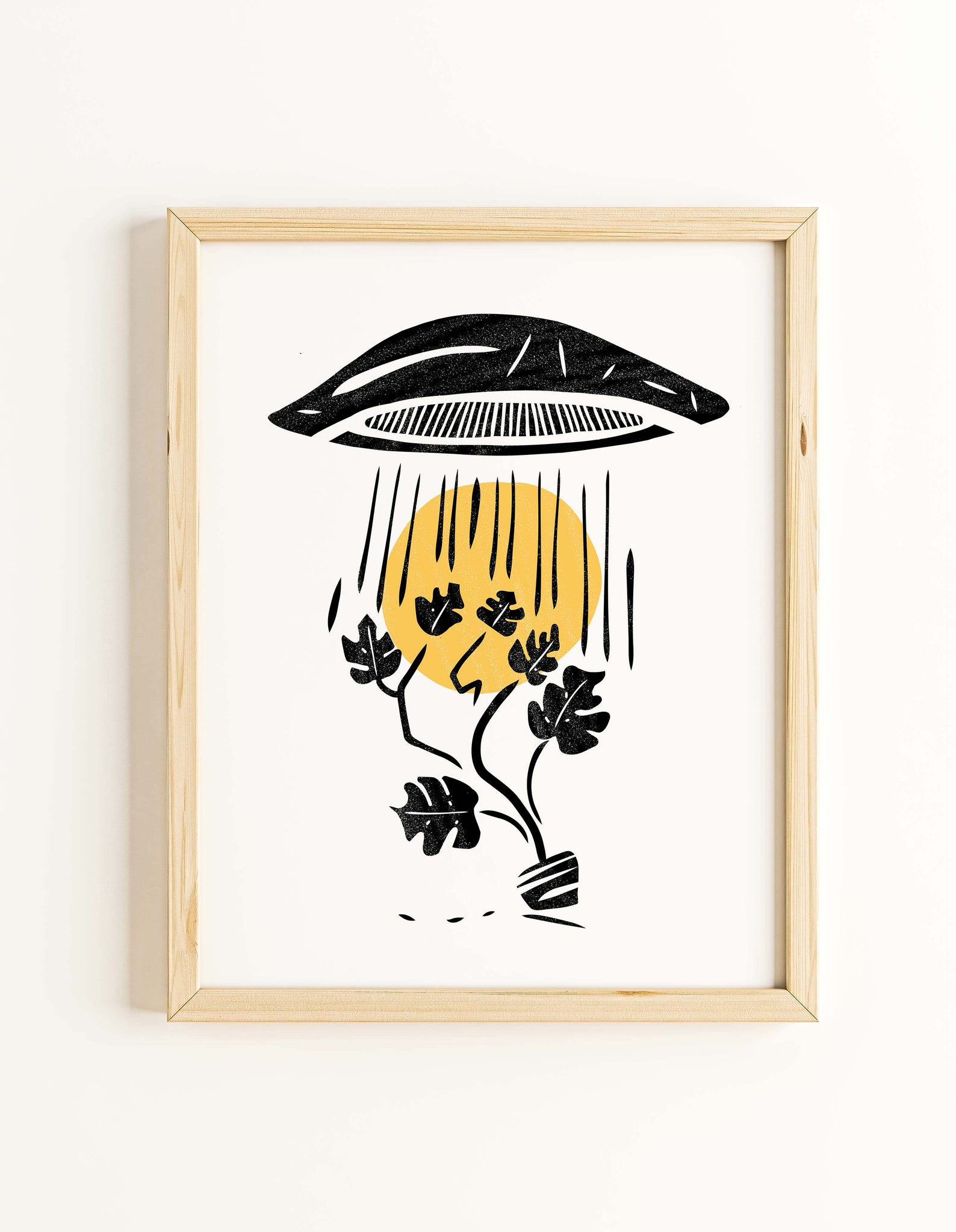 Is your monstera safe? In this 8×10 print, a bold black-and-yellow UFO swoops in to abduct a poor potted plant, turning an ordinary houseplant moment into a cosmic drama. Printed on sturdy 100# cover paper, each piece arrives snug in a clear sleeve with a backing board, ready to hang or gift.