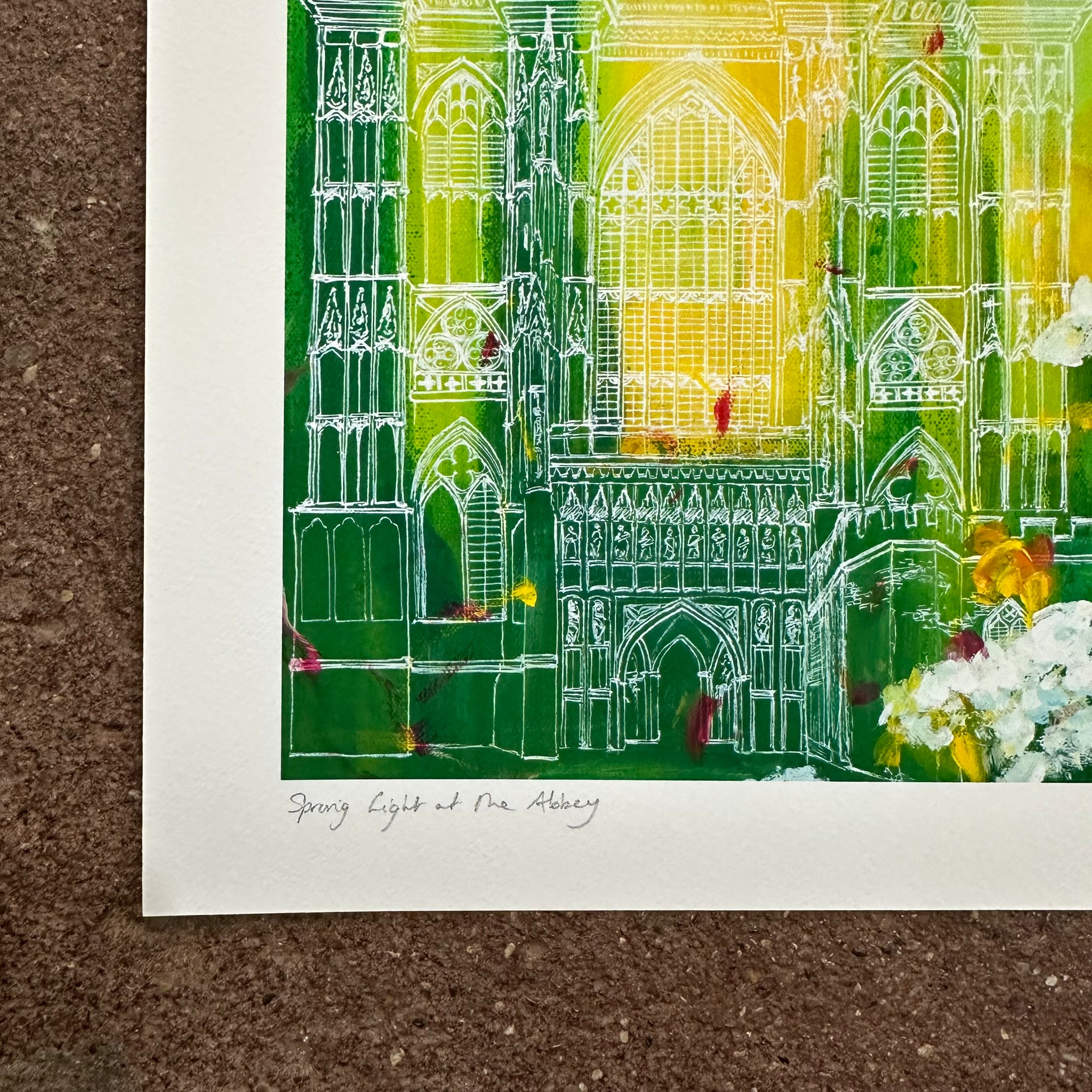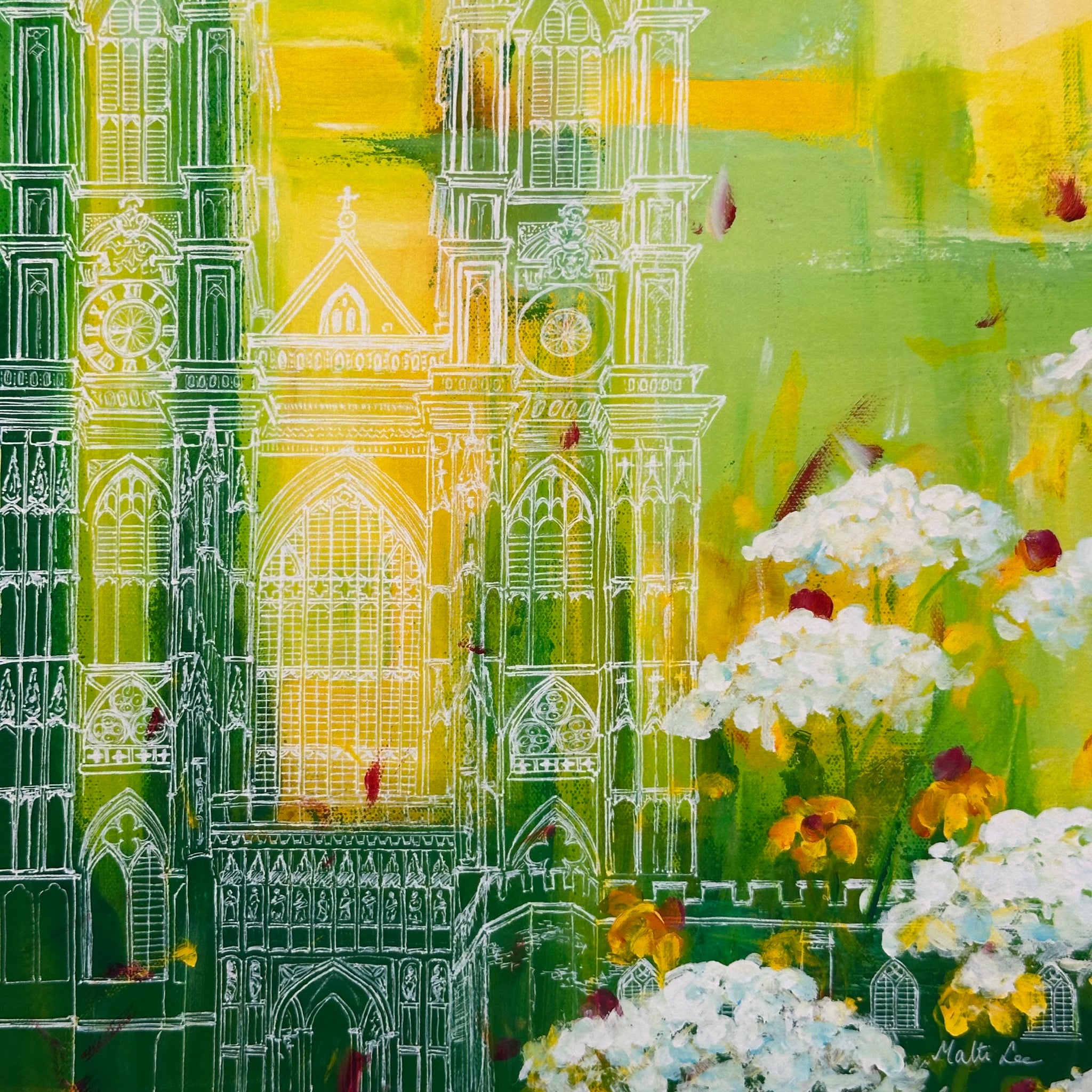 Spring Light at the Abbey is one of Malti B. Lee’s most heartfelt works — a painting that grew out of longing, reflection, and the quiet hope of new beginnings. Created during a year of separation from her family, the piece captures her sense of homesickness upon hearing of Queen Elizabeth II’s passing. In that moment, Westminster Abbey became more than a historical landmark; it became a bridge between memory and renewal, loss and light.