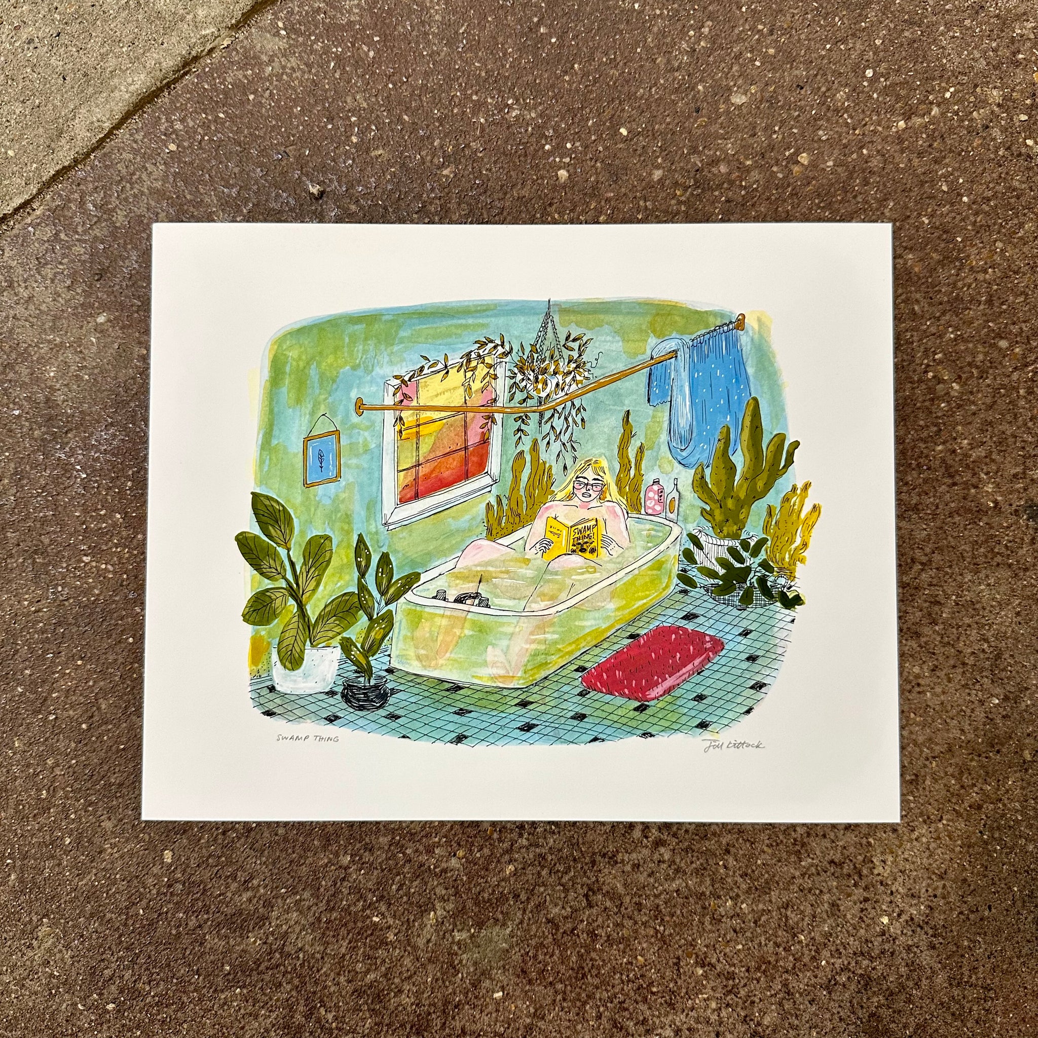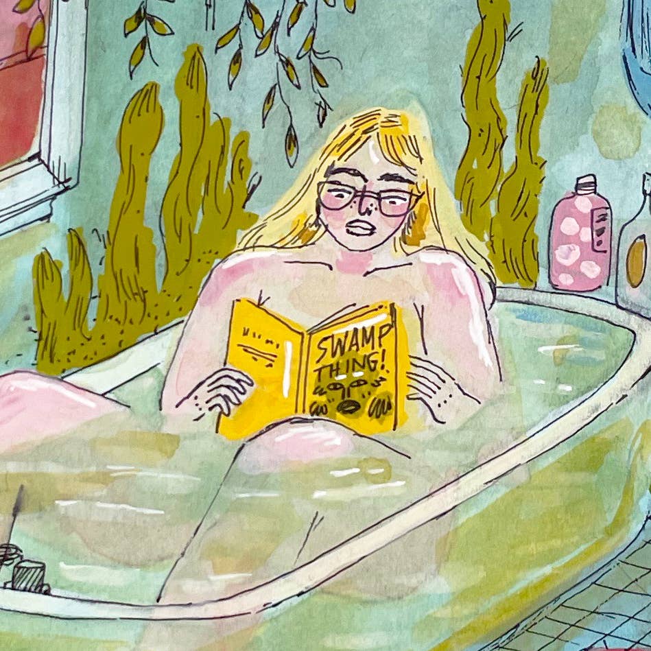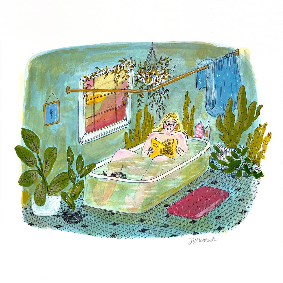 Jill Kittock’s Swamp Thing turns an everyday bath into something lush, humid, and wonderfully strange. The scene feels like a quiet escape — a woman soaking in a deep green tub, fully at peace, reading a copy of “Swamp Thing” while a jungle of algae and houseplants creeps up the tile walls. The colors are cool and misty, layered with soft gouache textures that make the whole bathroom feel half real and half enchanted greenhouse.