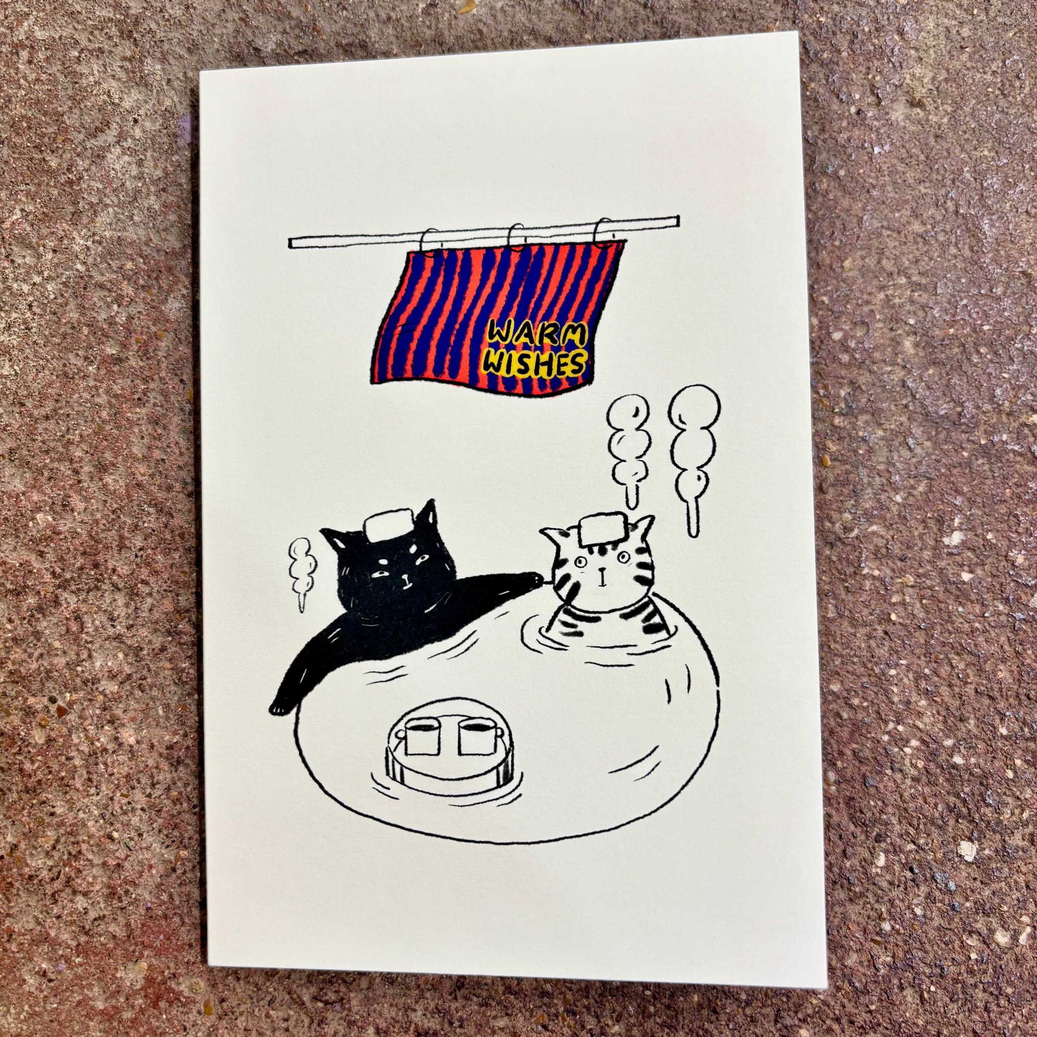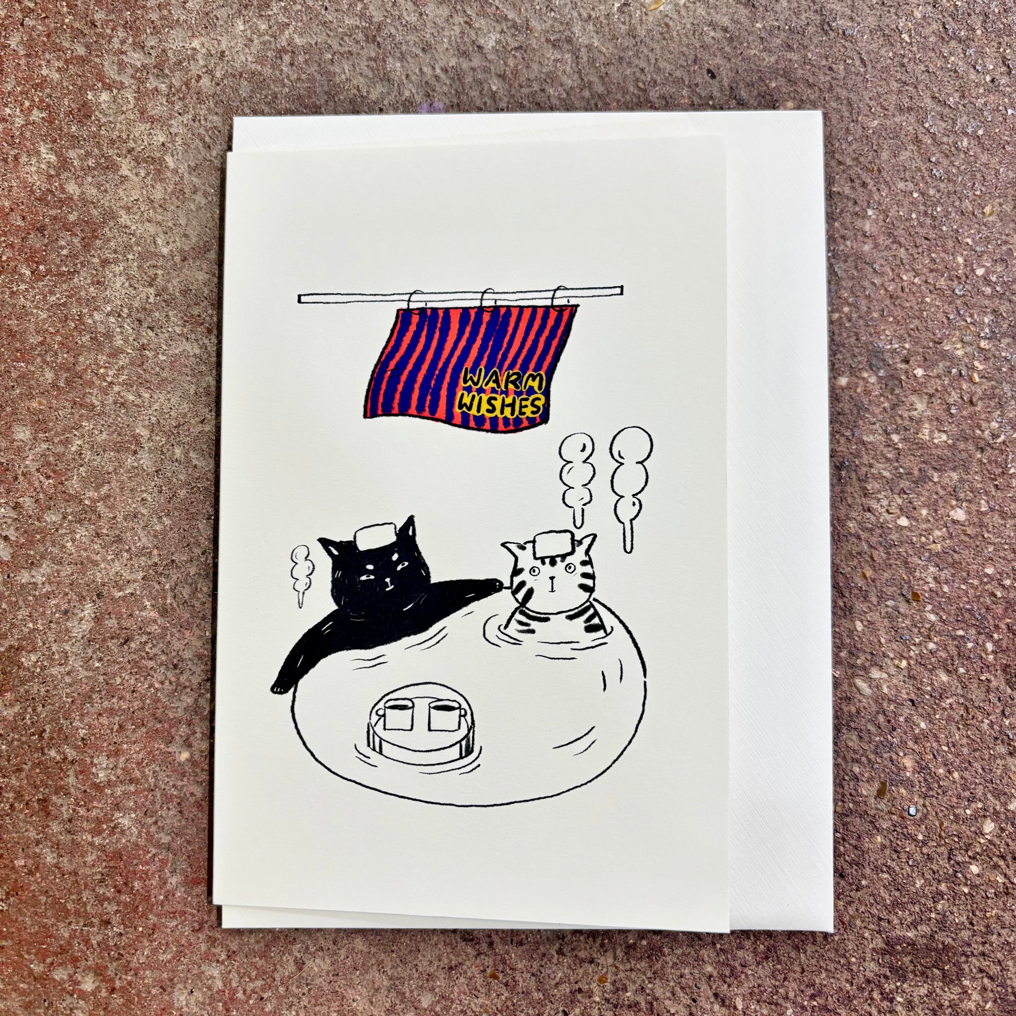 Two cats relaxing in an onsen (Japanese hot spring) send a message of calm and comfort. Illustrated by Linnan Ye of Neko.Co.Neko., this card is a playful way to share warm wishes, congratulations, or a thoughtful “thinking of you.”