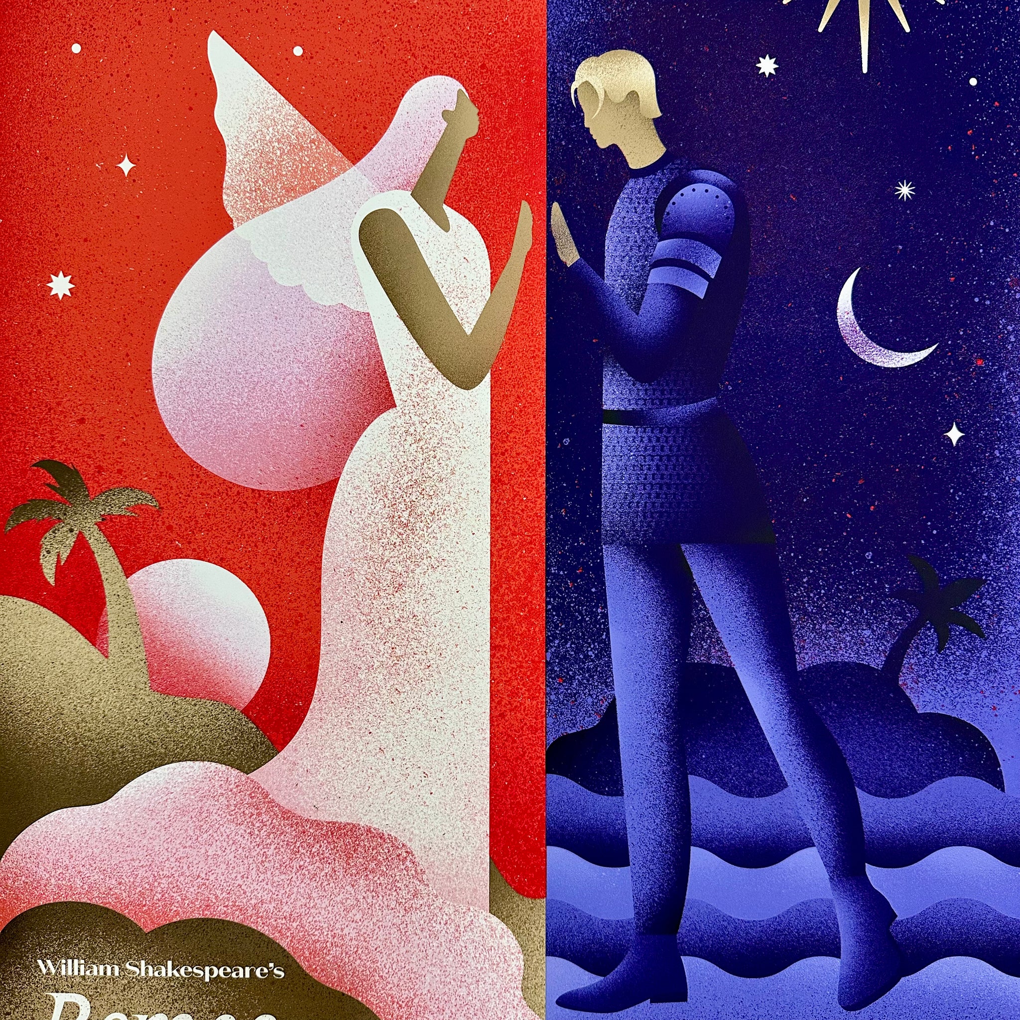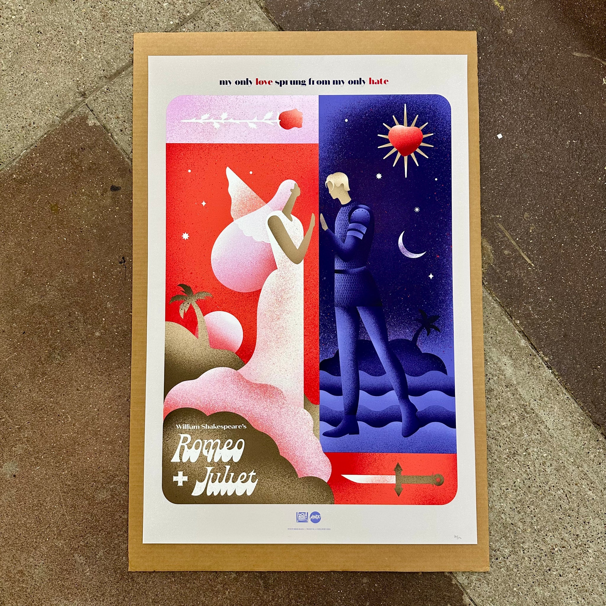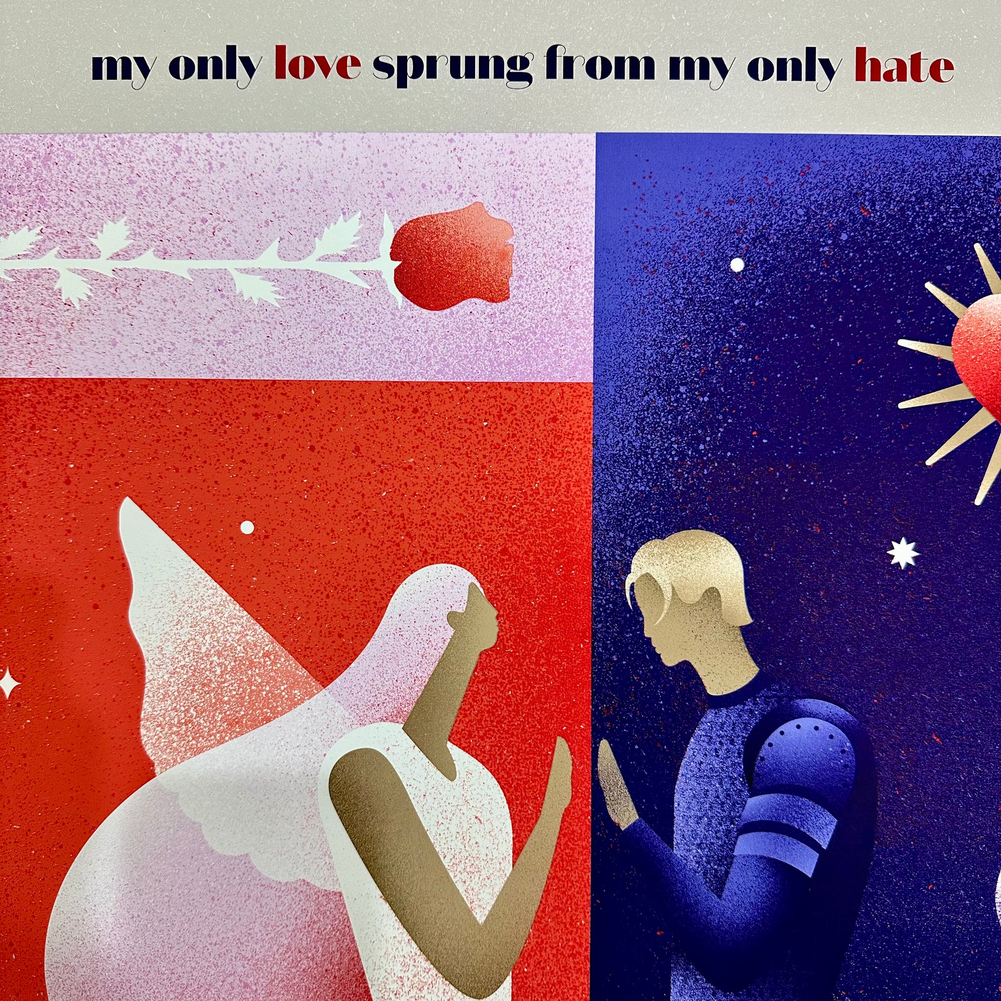 A striking, dreamlike interpretation of Baz Luhrmann’s Romeo + Juliet — this screen print by Bárbara Malagolichannels the feverish beauty of young love set against chaos. Released by Mondo in 2021, it transforms the film’s bold visual language into a piece of fine art: blooming reds for passion, deep violets for tragedy, and flashes of gold that hint at fleeting hope.