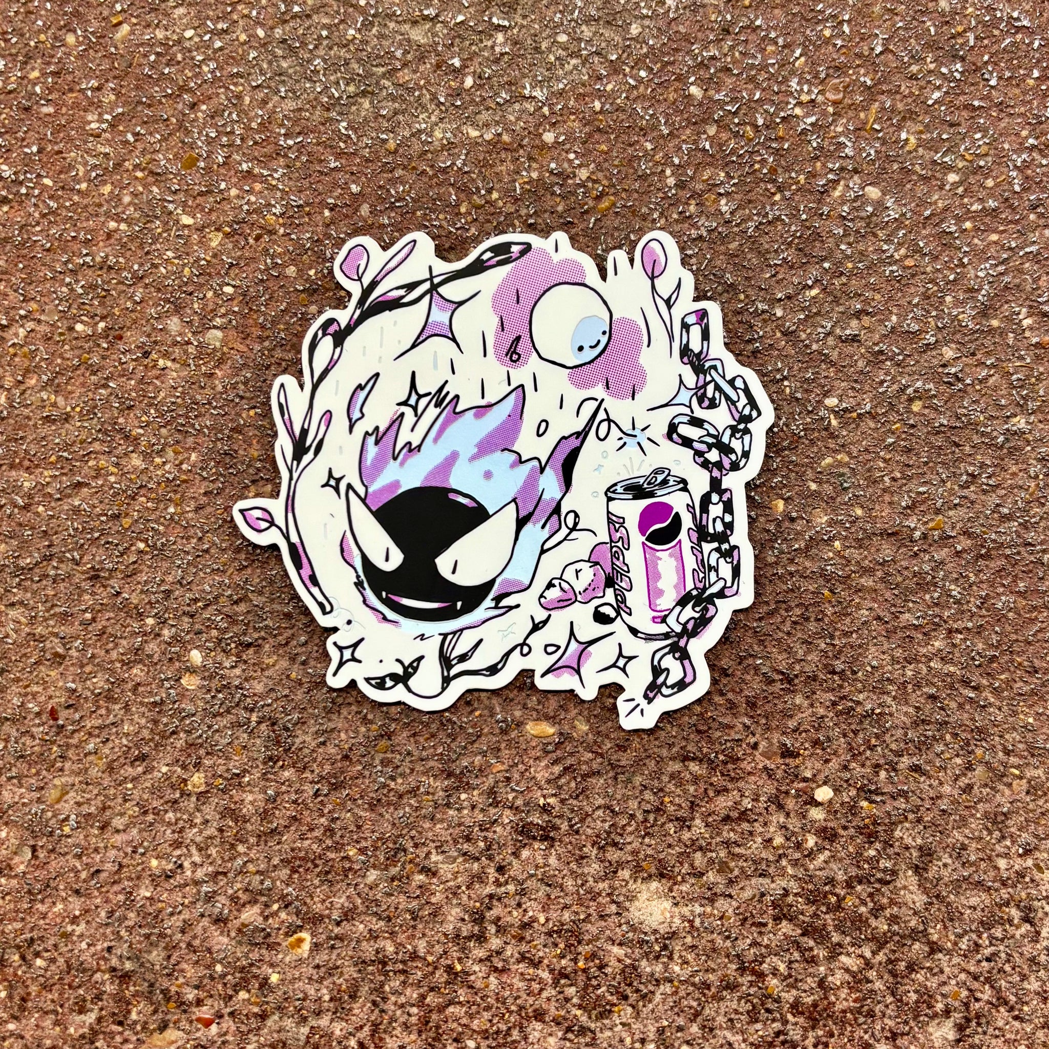 A little ball of poisonous gas, but make it cute. This sticker turns a certain ghost-type troublemaker into a pastel, swirly cloud with a big mischievous grin—like it just floated in to cause minor chaos and then nap on your laptop. Metallic details shimmer around the toxic mist, so it looks almost like it’s pulsing with spooky energy when the light hits.