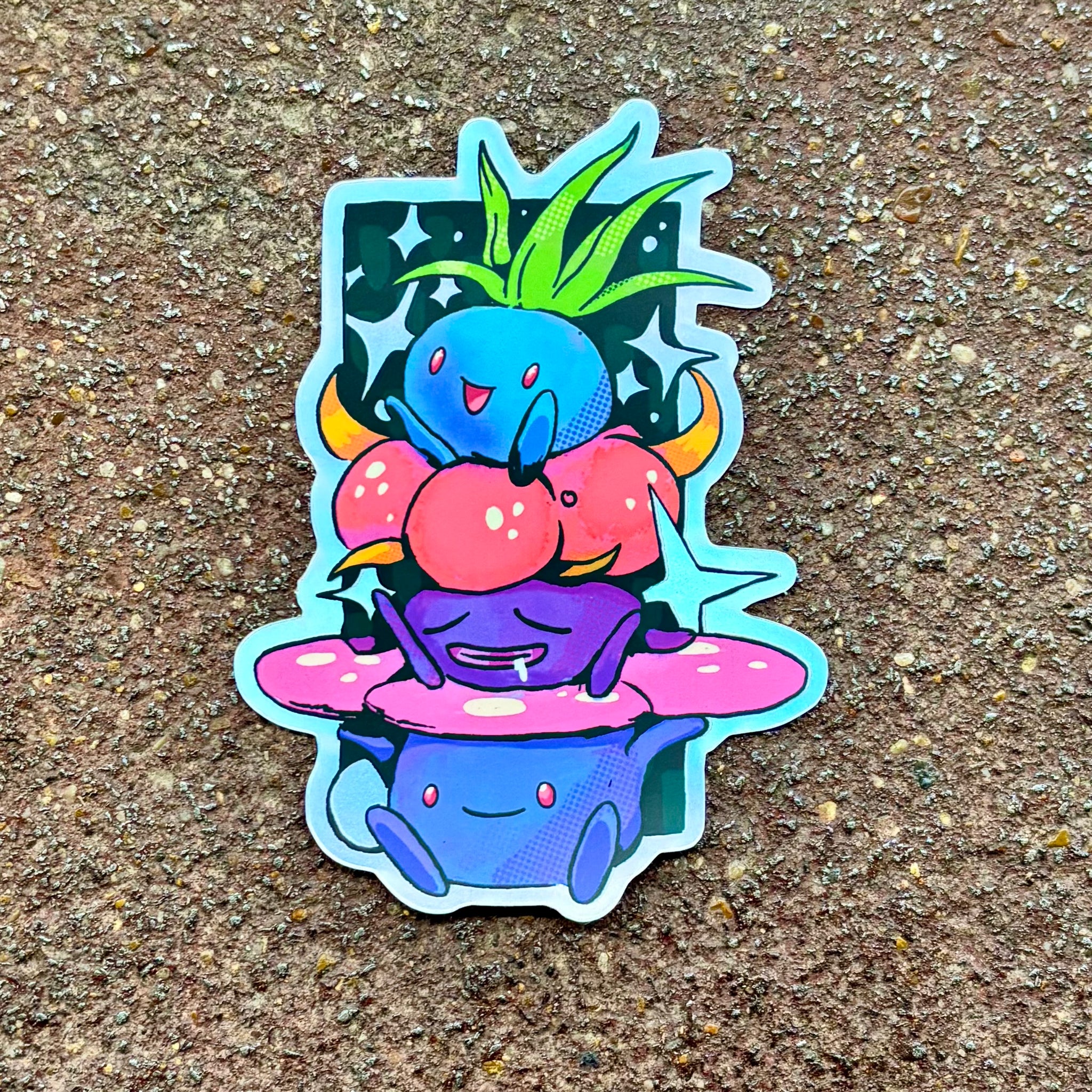A whole little Oddish family stacked under the stars. This sticker feels like a nighttime evolution chart flipped on its head: Oddish perched at the top like a cheerful sprout, Gloom in the middle looking delightfully spaced out, and Vileplume holding it down at the bottom with that giant flower in full bloom. Tiny stars float around them, like this nocturnal plant squad is just now clocking in for their night shift.