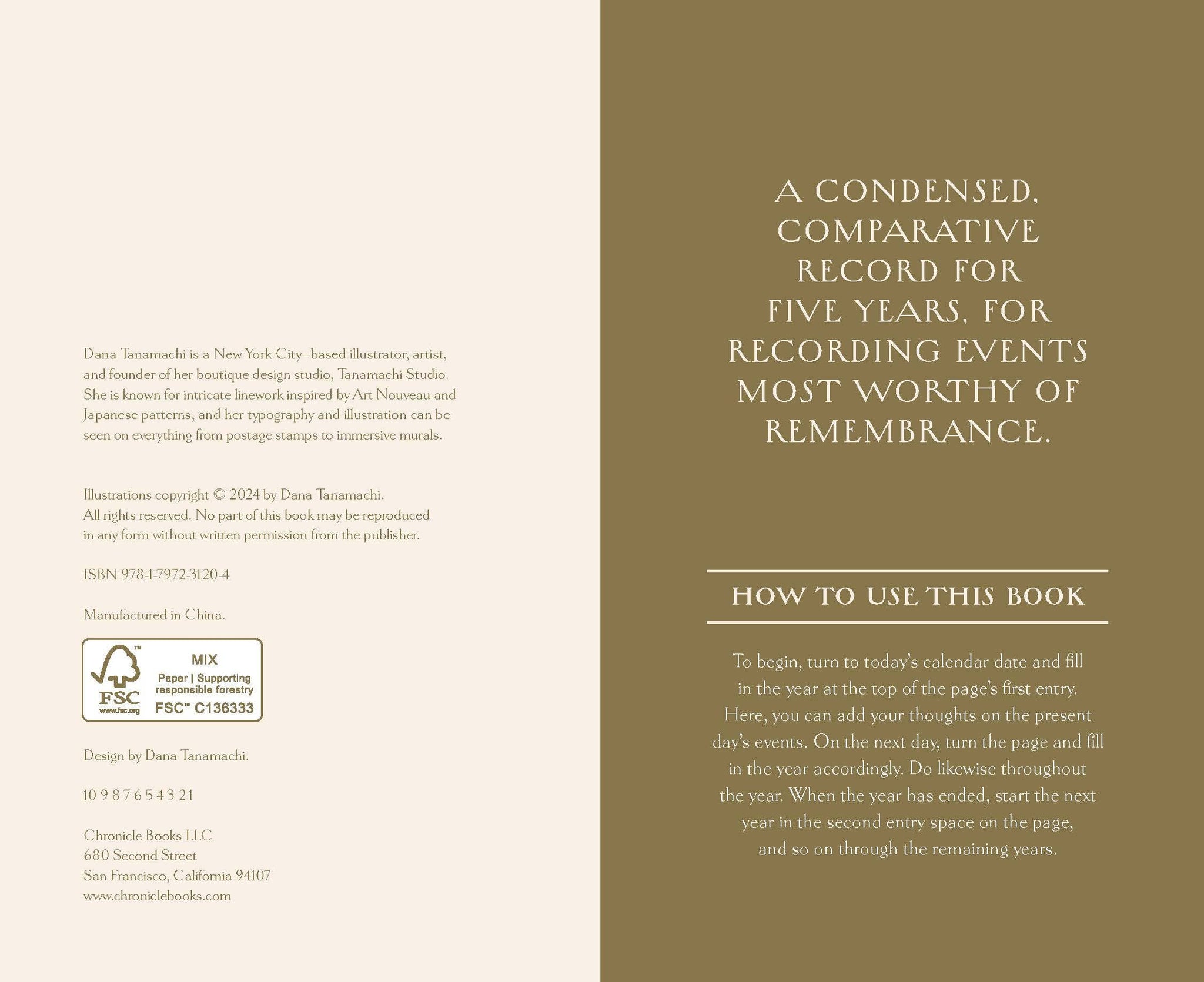 Capture a single moment each day and create a keepsake to treasure for years to come. This special edition of the bestselling One Line A Day journal features elegant foil-stamped artwork by Dana Tanamachi and a rich, warm cover that feels timeless and luxurious. With space to record one line per day over five years, this compact journal helps you reflect, appreciate, and preserve memories in a beautifully simple way.